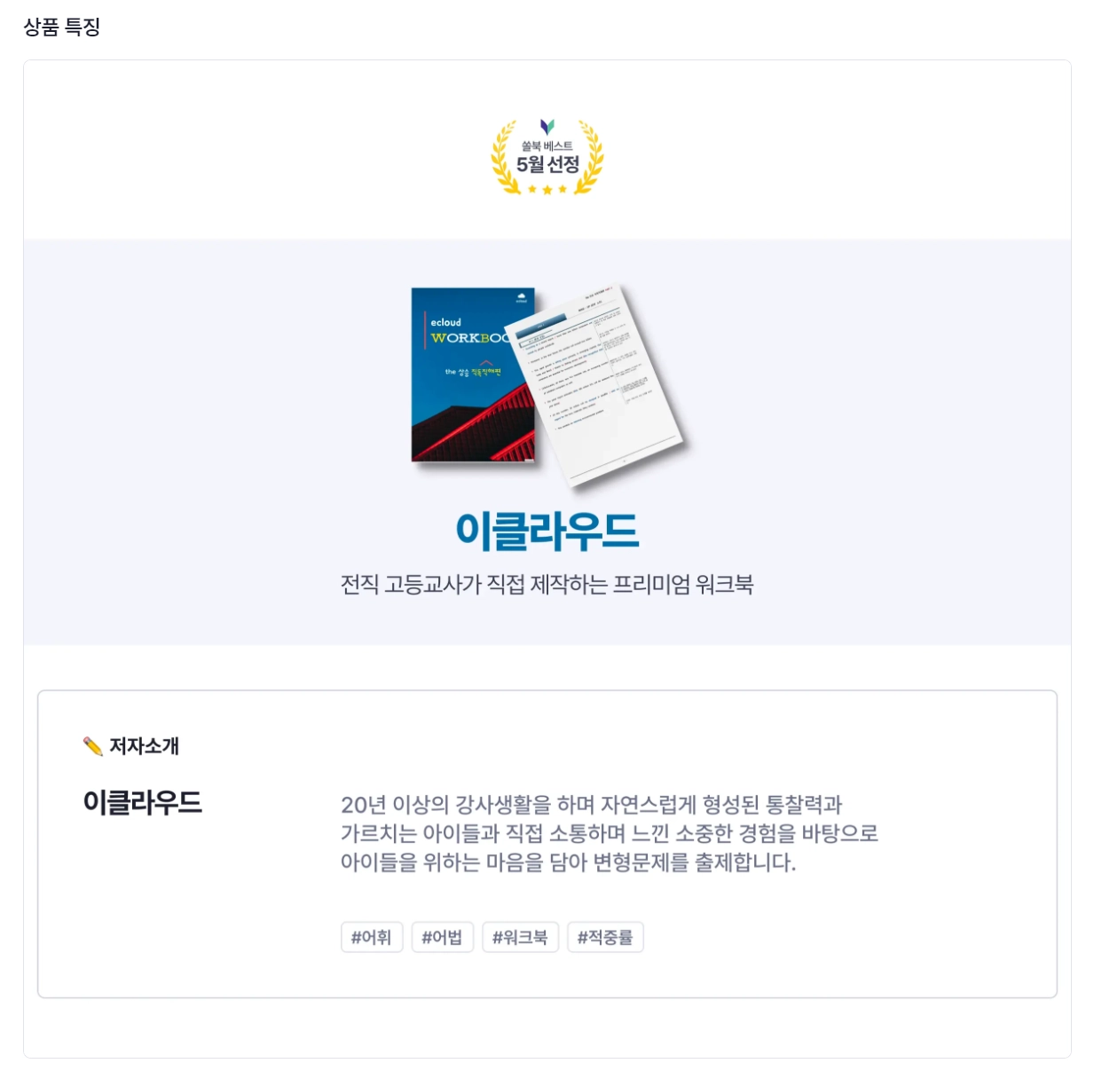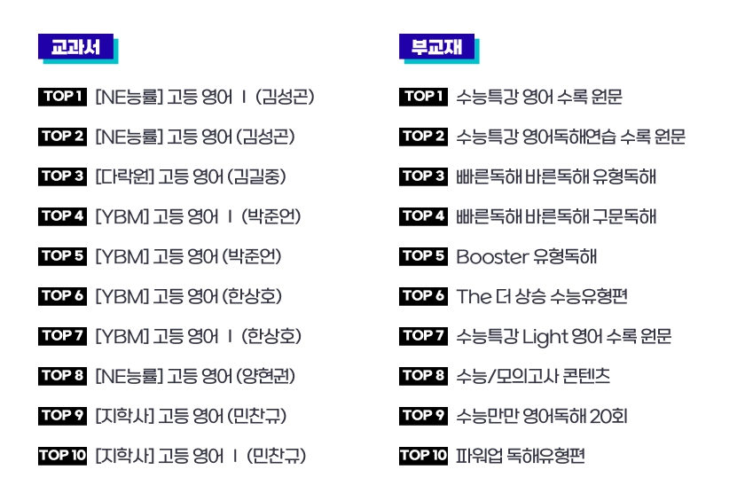 비교적 점유율이 낮은 편인 다락원 교과서가 3위까지 올라온 점이 매우 놀라운데요. 자료의 공급 대비 수요가 더 큰 편이라 구매가 활발했던 것 같습니다. 반면 부교재는 기존에도 점유율이 높던 빠바 시리즈가 다시 높은 순위로 올라왔고, 특히 쎄듀의 파워업 독해유형편 교재가 10위권 안으로 진입했어요. 수능/모의고사 콘텐츠의 순위는 약간 내려갔지만 6월 모의고사 자료가 판매되면서 더 높은 순위로 올라갈 것 같습니다.