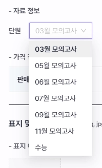 연도뿐만 아니라 특정한 월에 시행한 모의고사 자료가 잘 구분될 수 있도록 단원값을 추가했습니다. 자료를 업로드하실 때, 몇 월 모의고사의 자료인지 단원으로 선택해 보세요. 여기에 3모, 6모 같은 줄임말을 키워드로 추가해 두면, 검색이 편리해져 더욱 잘 노출되겠죠?