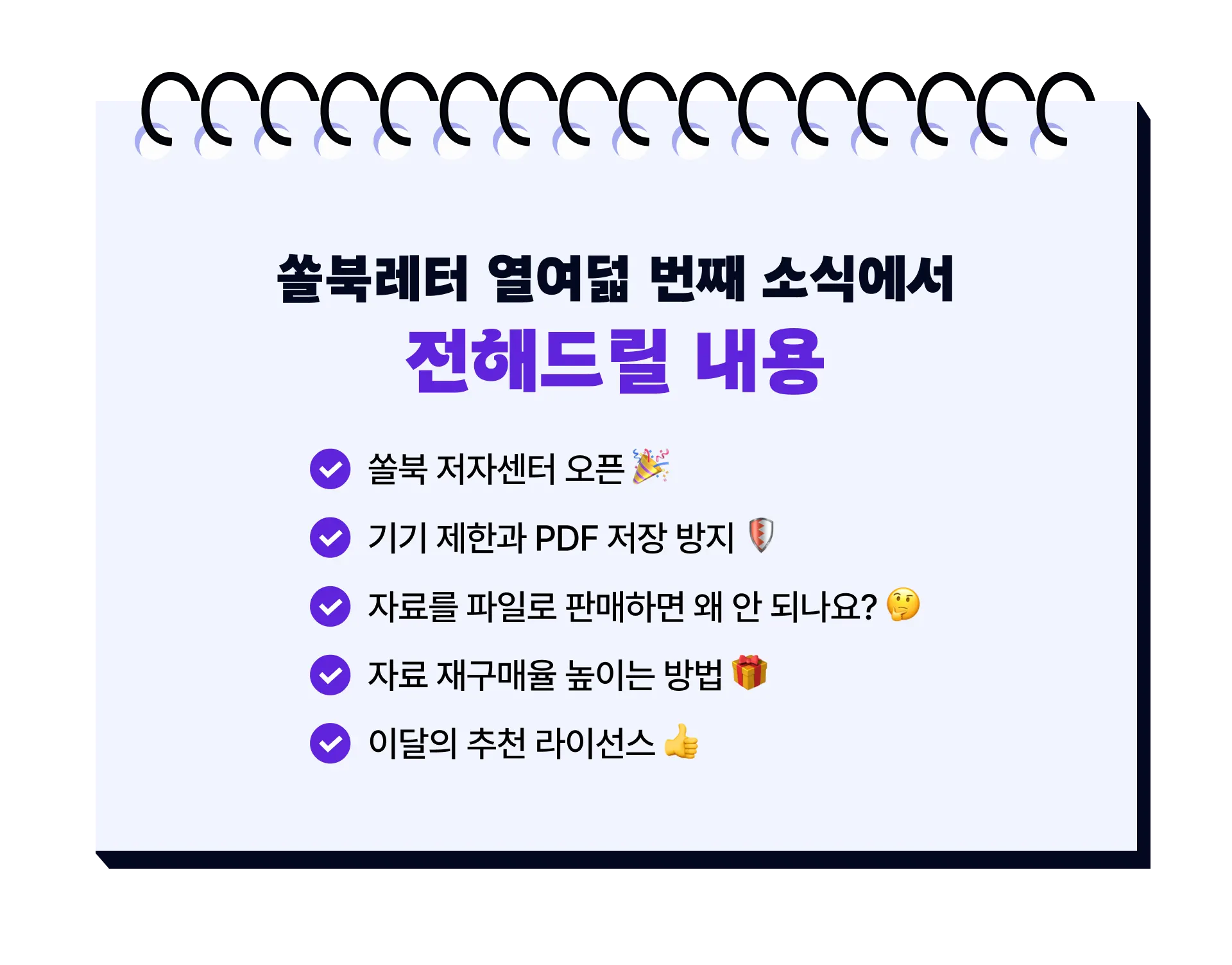 쏠북에 자료를 업로드하시는 저자분들을 대상으로, 매달 쏠북의 소식과 다양한 꿀팁을 전해드리는 쏠북레터! 오늘은 저자분들의 권익을 보호하기 위한 쏠북의 다양한 조치와, 자료 재구매율을 높이는 방법에 대해 안내해 드릴게요.