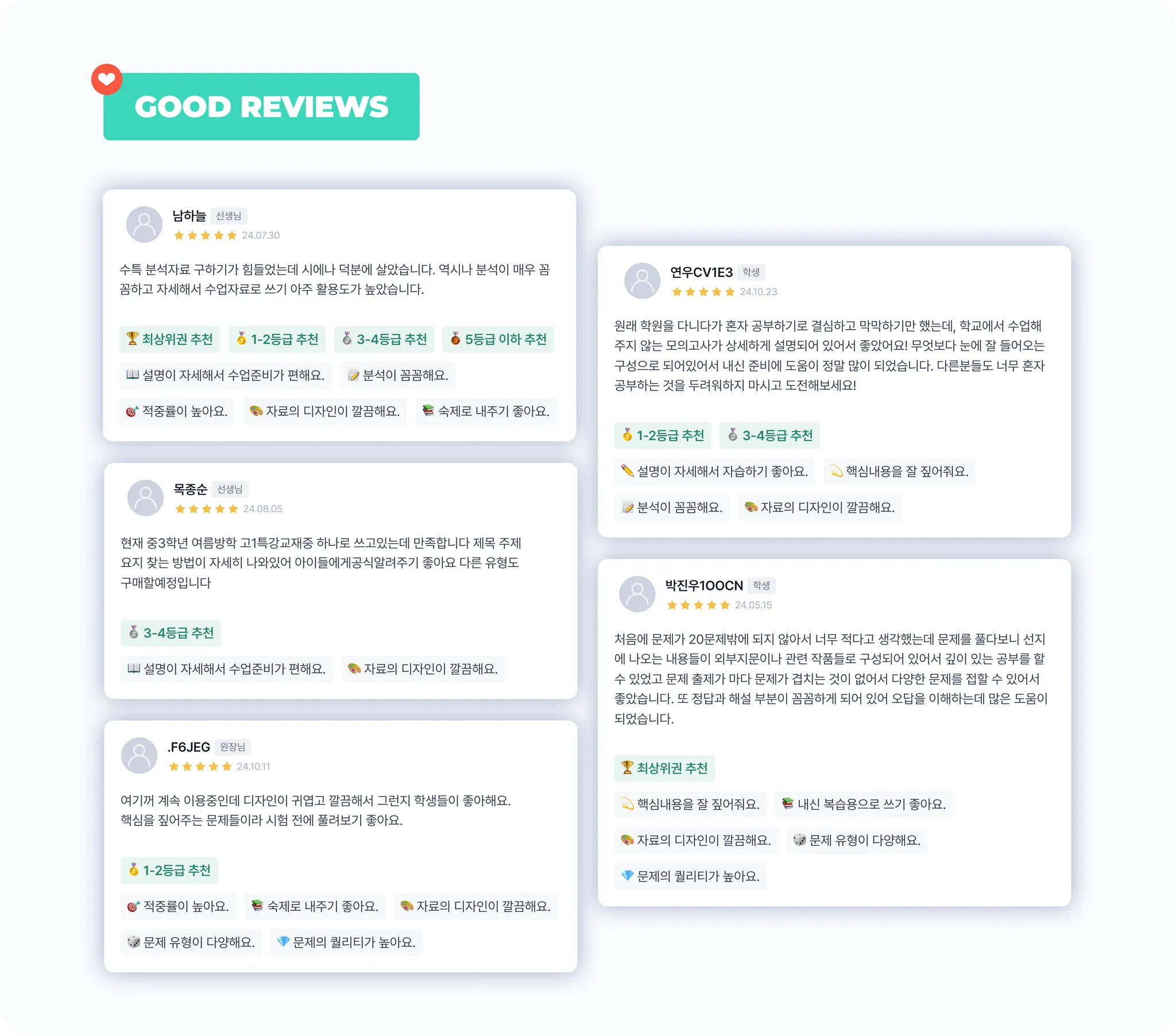 반면, 재구매율이 높은 자료는 환불율이 매우 낮았는데요. 이러한 자료에는 오류와 관련된 후기가 거의 없고, 실제로 이용했을 때 좋은 점을 상세하게 적어주신 후기가 많다는 특징이 있었습니다. 수업 현장에서 자료를 사용할 때 오류가 없는 것은 기본이고, 여기에 더해 문항의 퀄리티나 꼼꼼한 분석 등이 더해져 이용자의 편의를 극대화했다는 내용이에요. 몇 가지 예시를 보여 드리겠습니다.