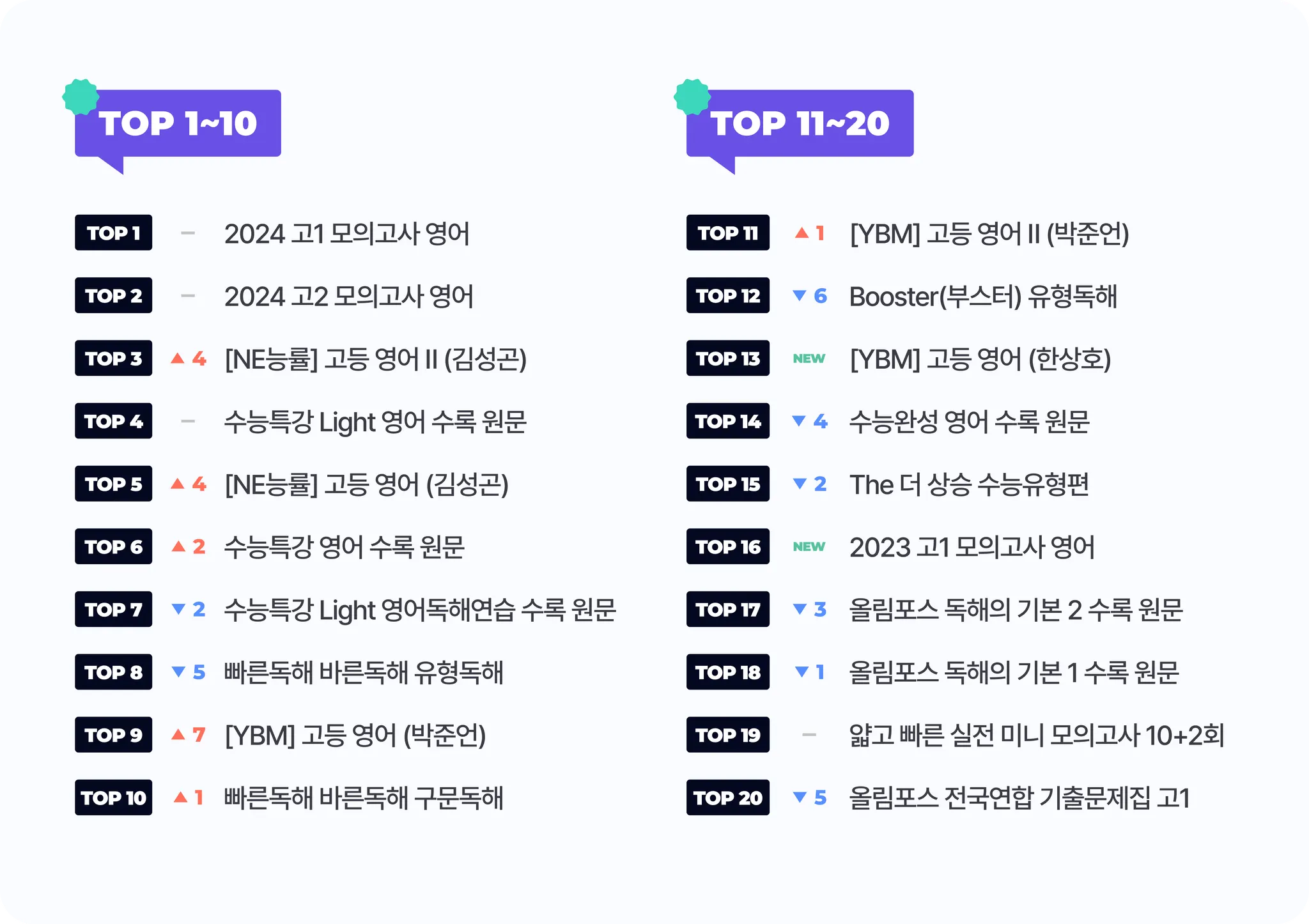 여전히 고1, 고2 모의고사 라이선스가 상위권을 지키고 있는 모습입니다. 이 외에도 교과서들이 큰 폭으로 상승했고, 부교재들은 비교적으로 순위가 하락했어요. 작년이나 다른 달의 순위가 궁금하시다면, 이전 쏠북레터를 참고해 주세요!
