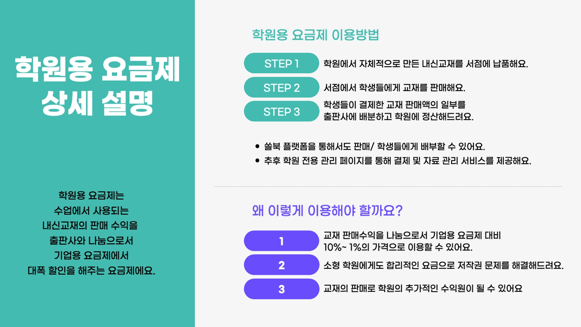 저작권료 부담 완화: 학생 수나 매출 규모에 따라 할인 제공, 부담 경감.