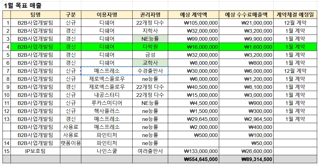 매스프레소 | NE능률 | 진행 중 | 2024년 종료 계약 갱신 필수 . | 1/10 박인규 팀장님께 리스트 전달 받아 금주 진행 예정 |