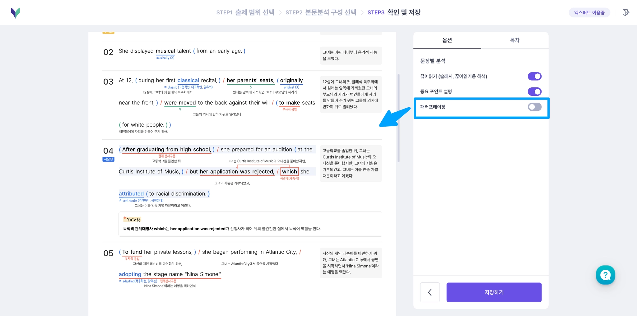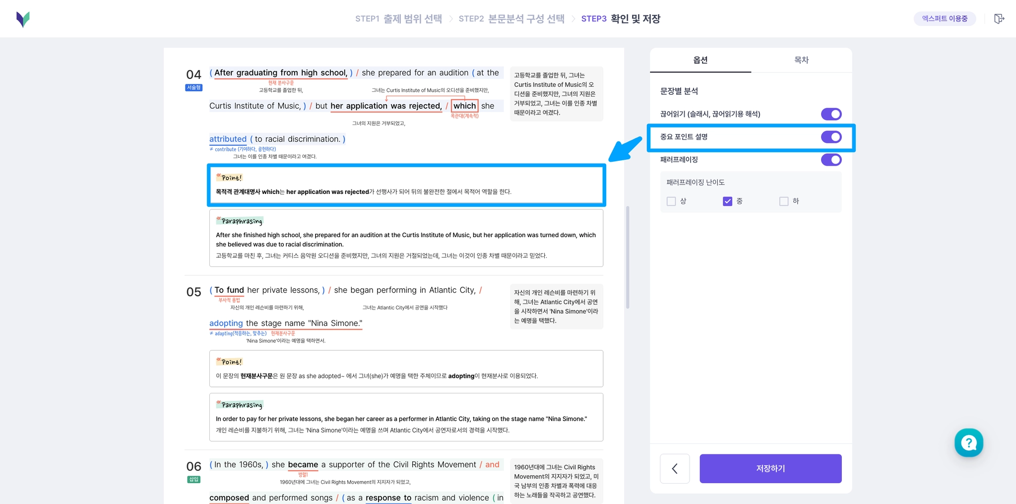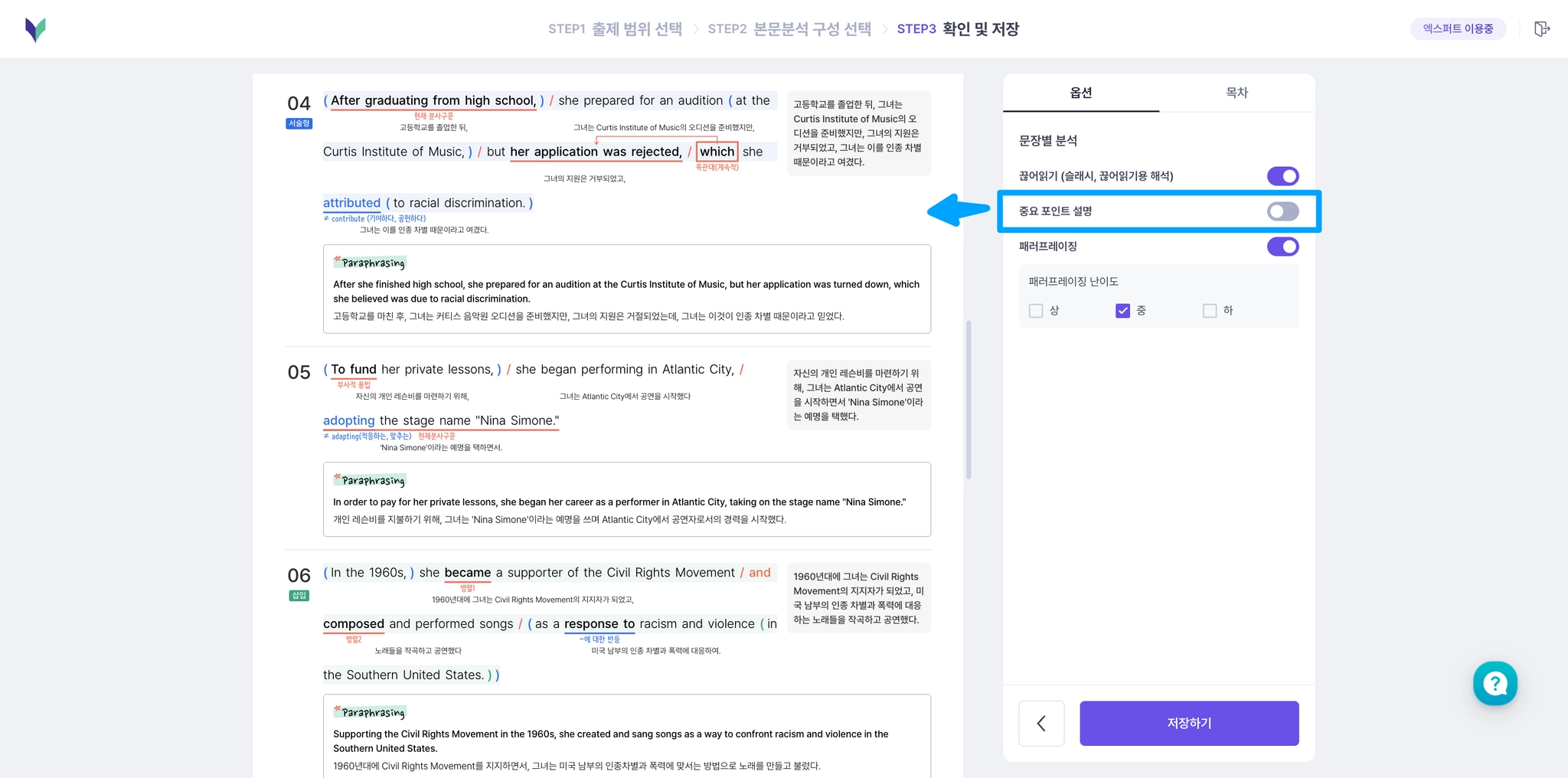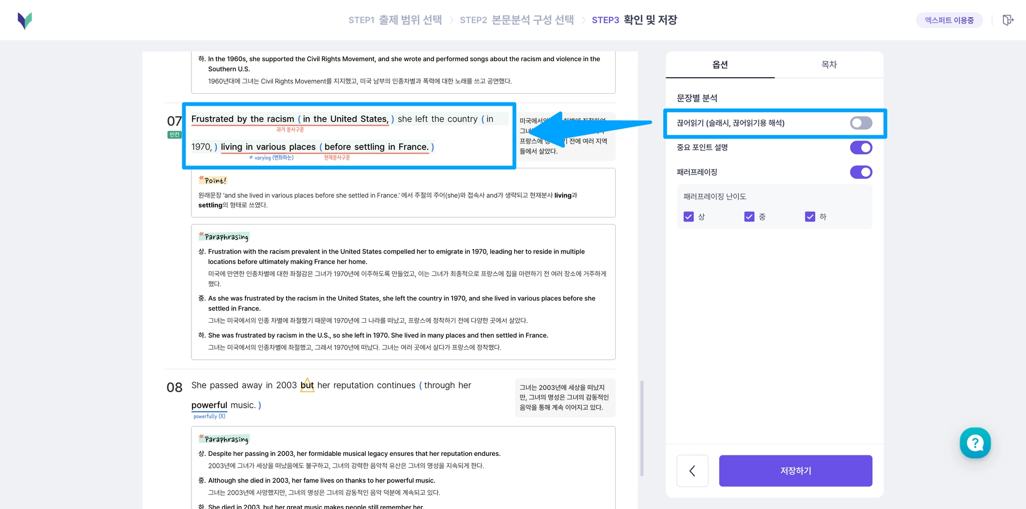 문장별 분석에 끊어읽기, 중요 포인트 설명, 난이도별 패러프레이징을 선택할 수 있어요.