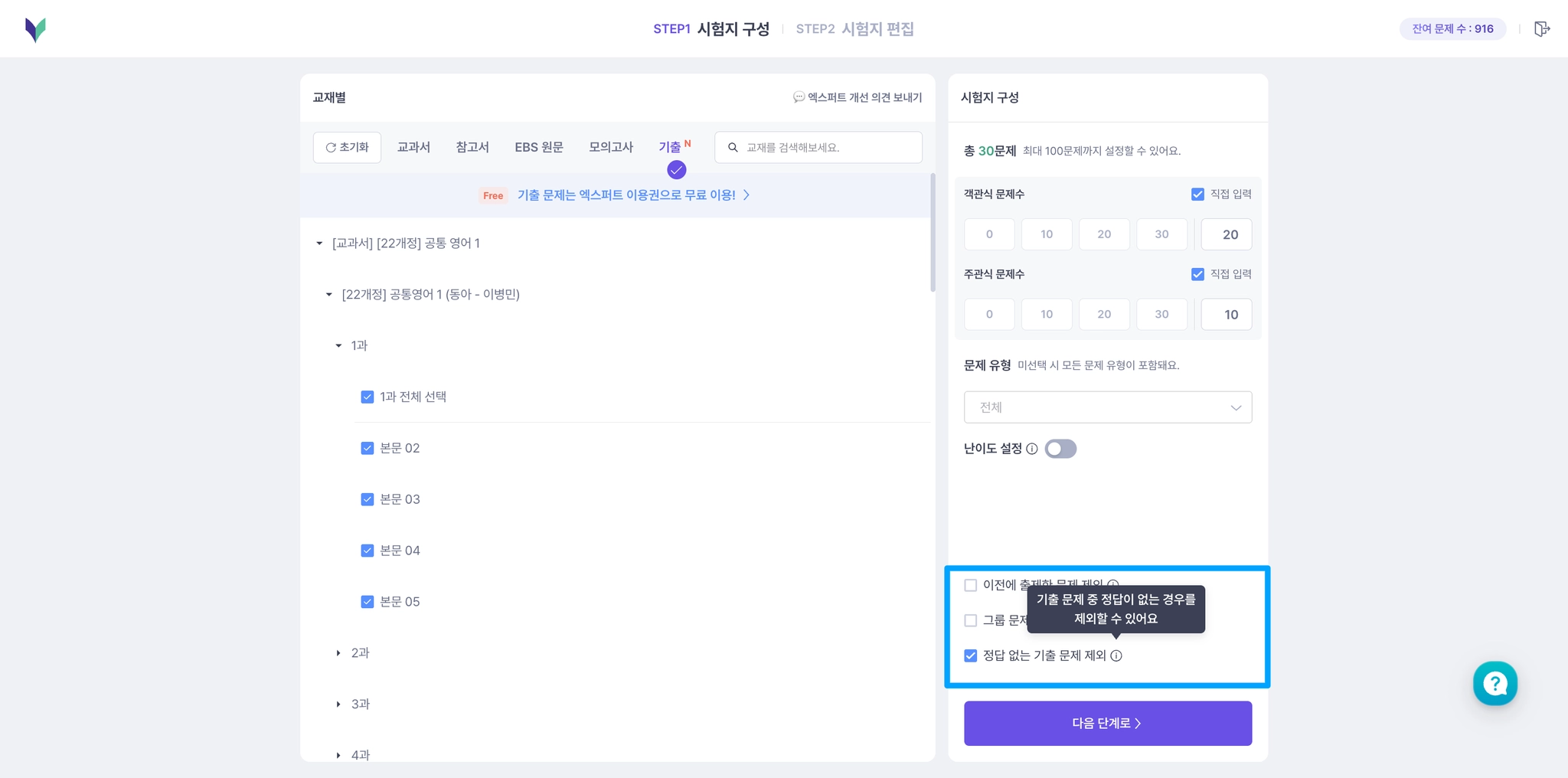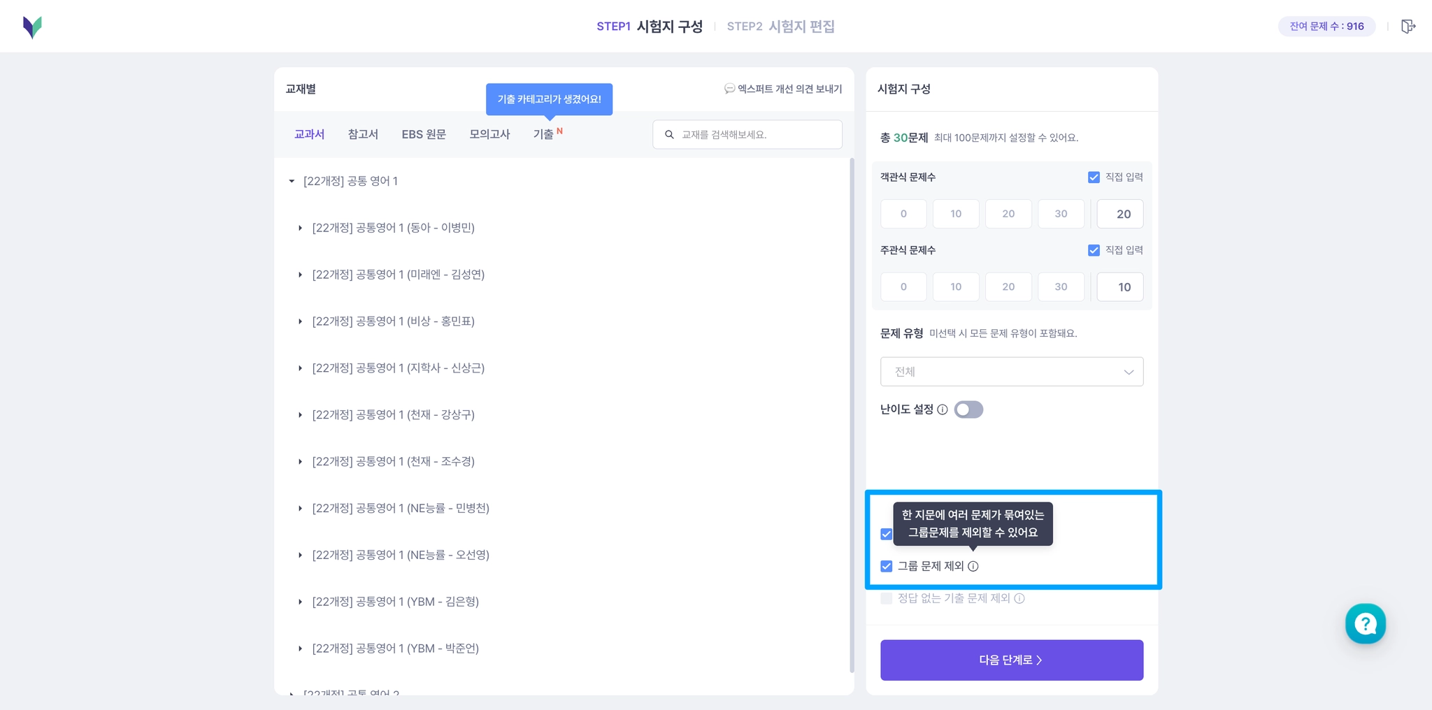 영어 변형문제에서 ‘그룹형 문제’, ‘정답 없는 기출’ 의 제외 여부를 선택할 수 있어요.