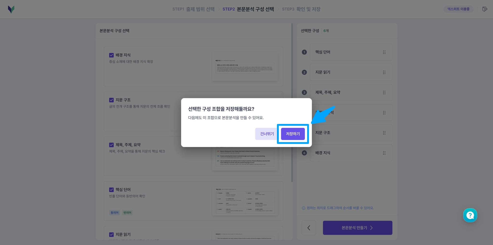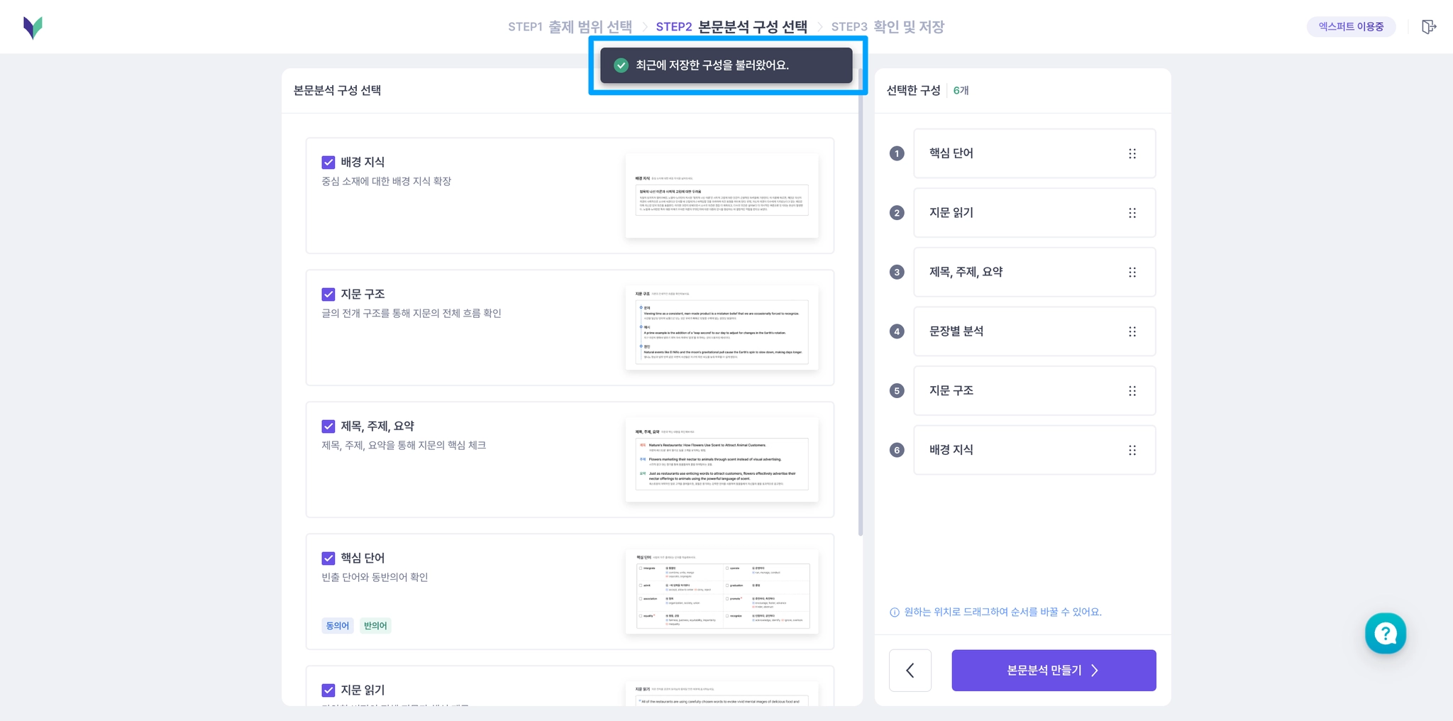 구성 조합을 저장하면, 다음 본문분석을 만들 때는 저장된 조합으로 더 빠르게 만들 수 있어요!
