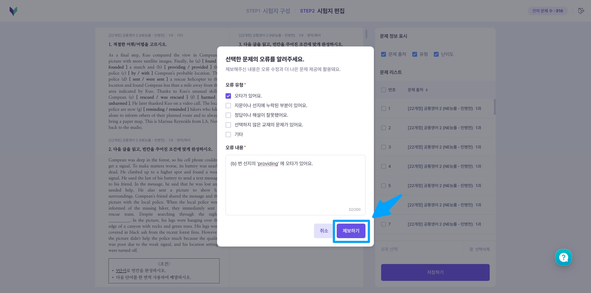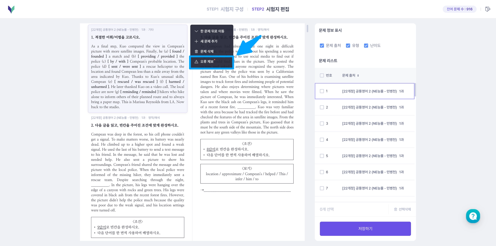 영어/국어 변형문제 시험지의 <시험지 편집> 단계에서, 오류가 의심되는 문제를 바로 제보할 수 있어요.