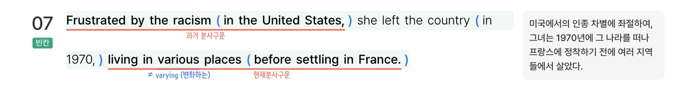 영어 문장에는 슬래시 ‘ / ‘ 로 표시되며, 아래에 끊어읽기 단위의 한글 해석이 표시되어요.