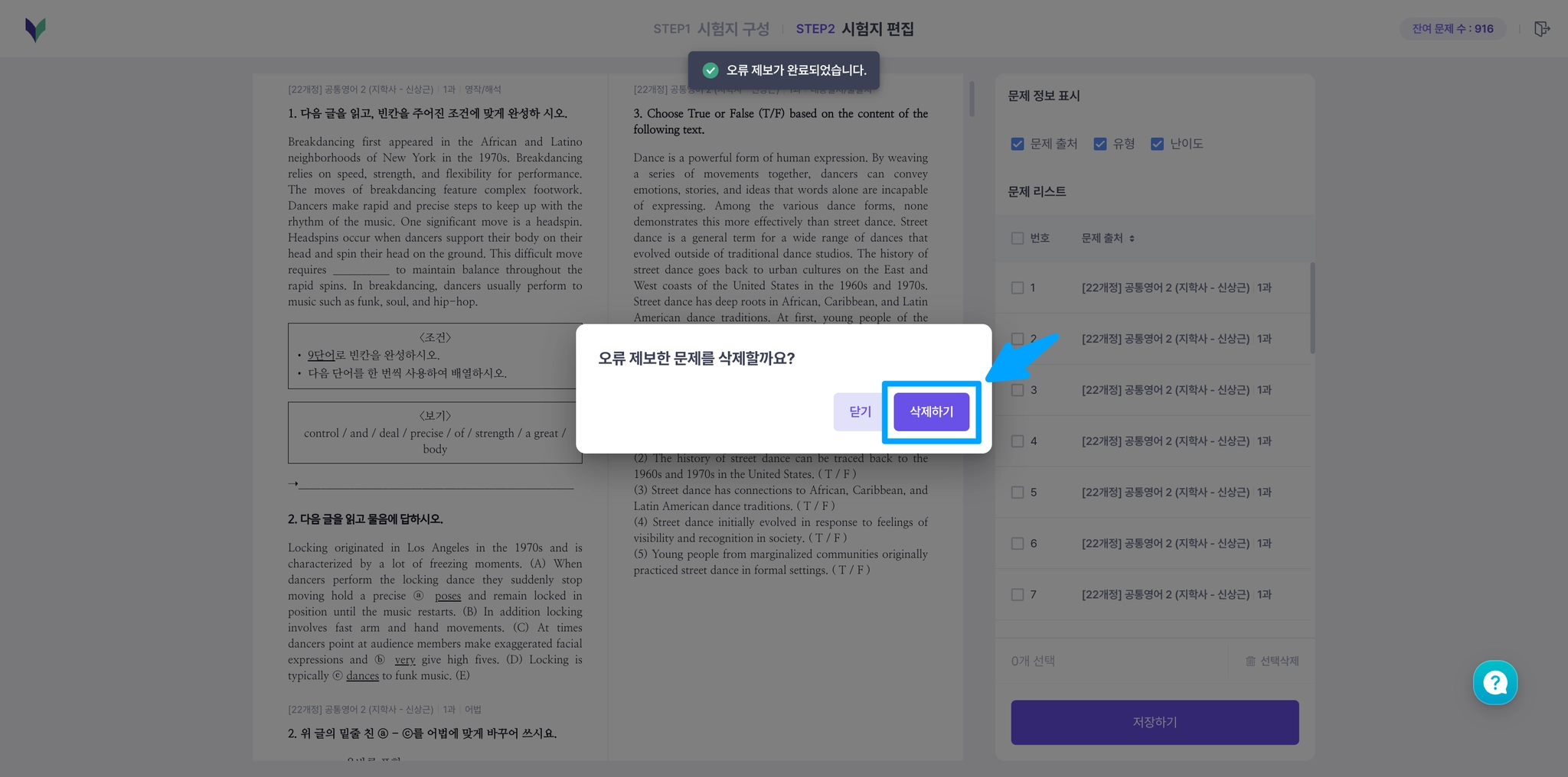 제보한 문제는 시험지에서 바로 삭제할 수 있어요.