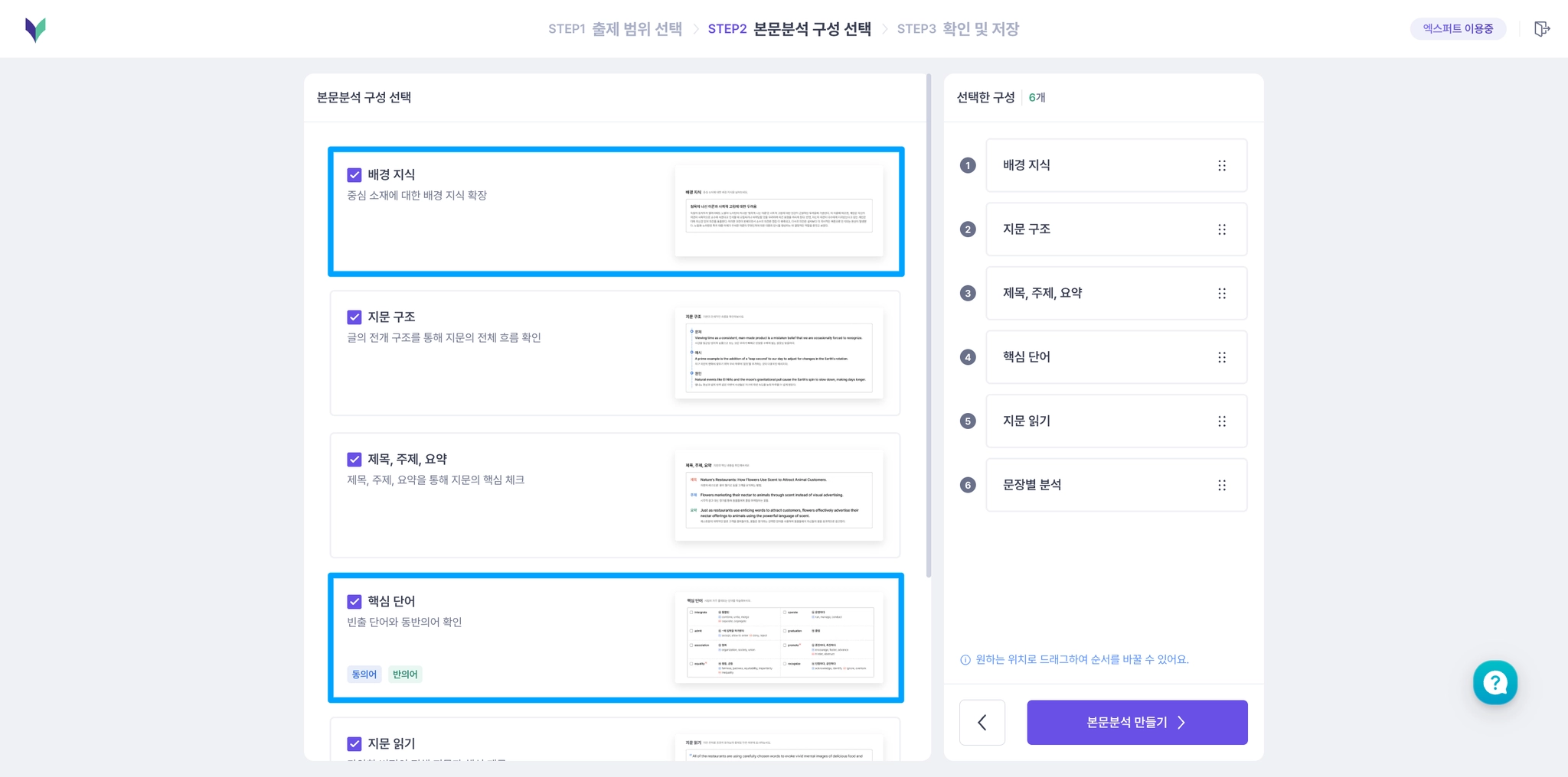 본문분석 만들기 <STEP 2. 본문분석 구성 선택> 단계에서 새로운 구성 2종을 선택할 수 있어요!