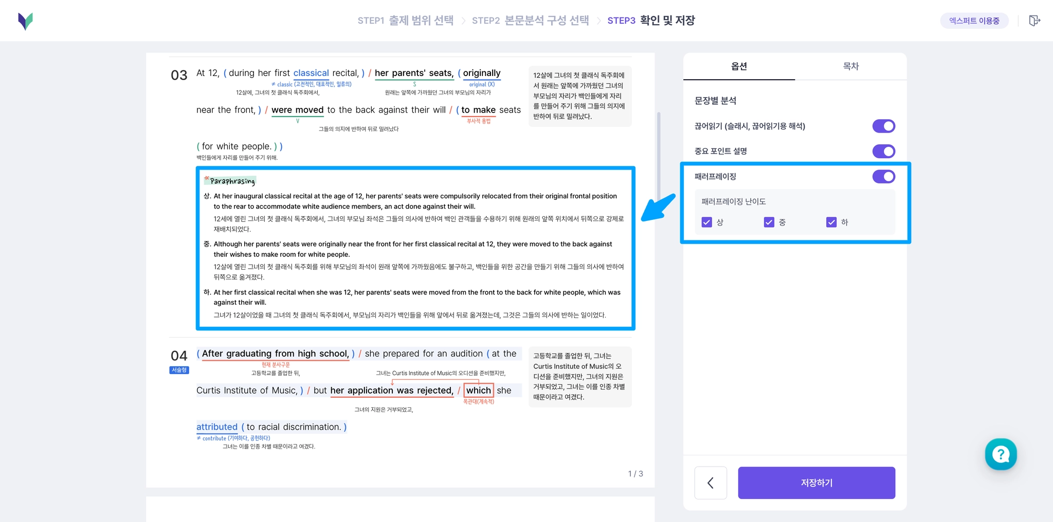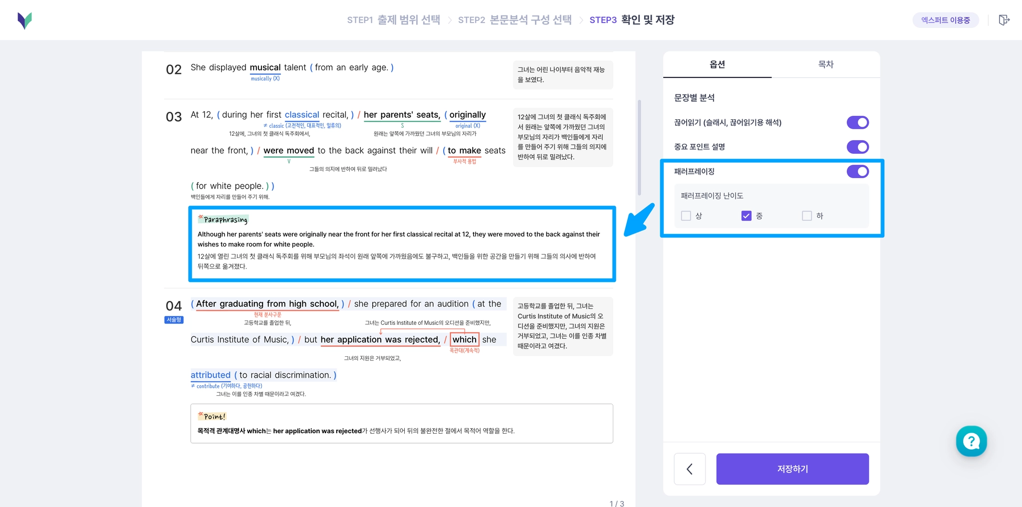 패러프레이징이 표시된 문장별 분석의 예시 이미지 (중 난이도 선택)