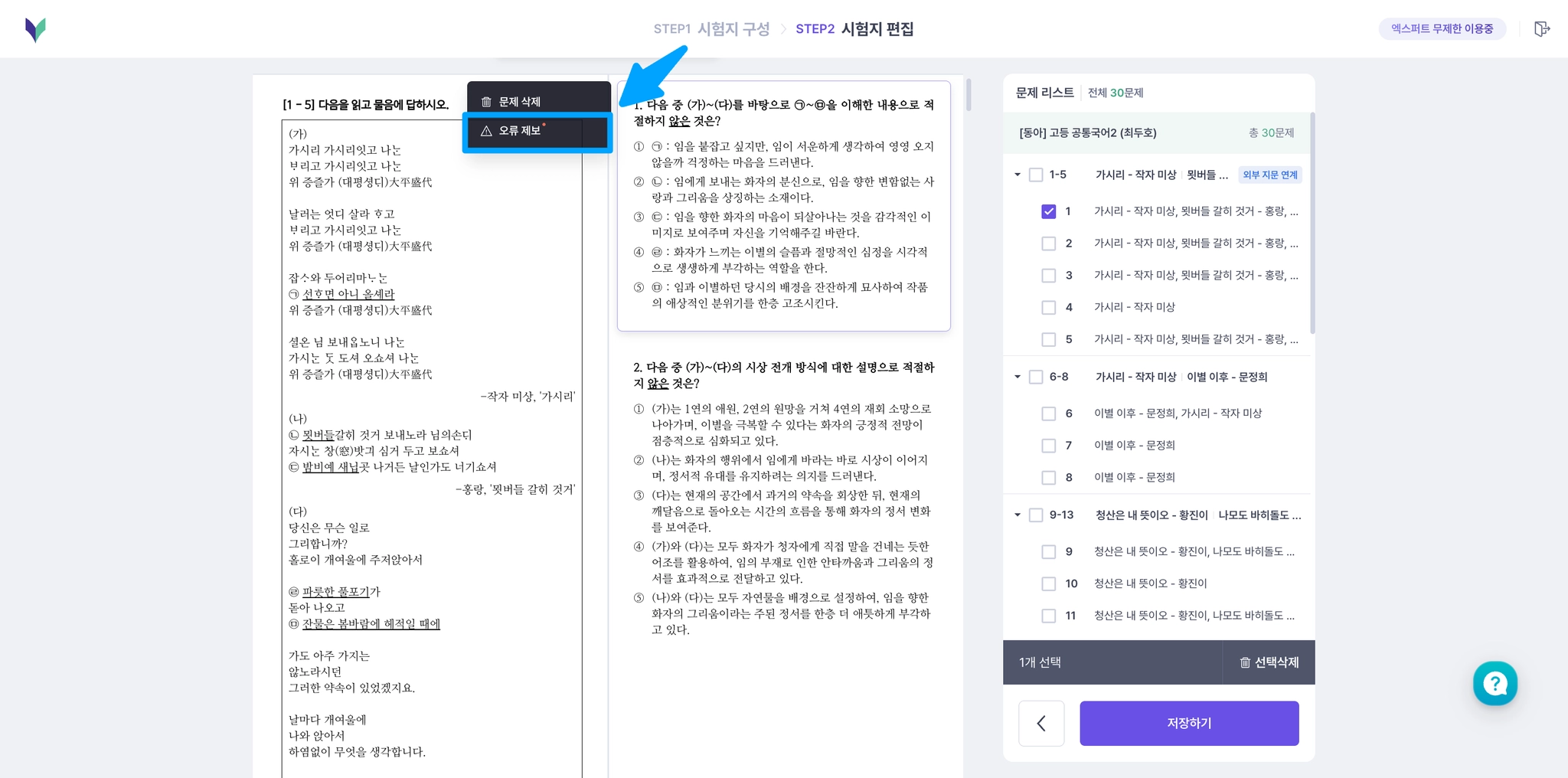 국어 변형문제 시험지 만들기 > 오류제보 메뉴 위치