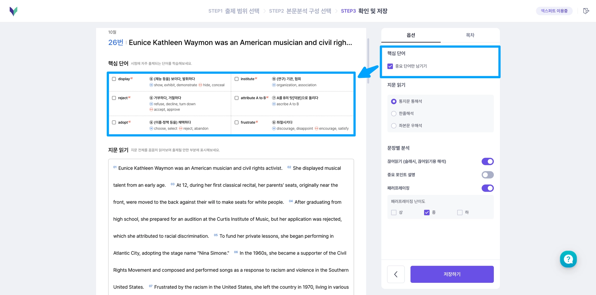 자료를 확인하는 <STEP 3. 확인 및 저장> 단계에서 ‘문장별 분석’ 의 옵션을 선택할 수 있어요.