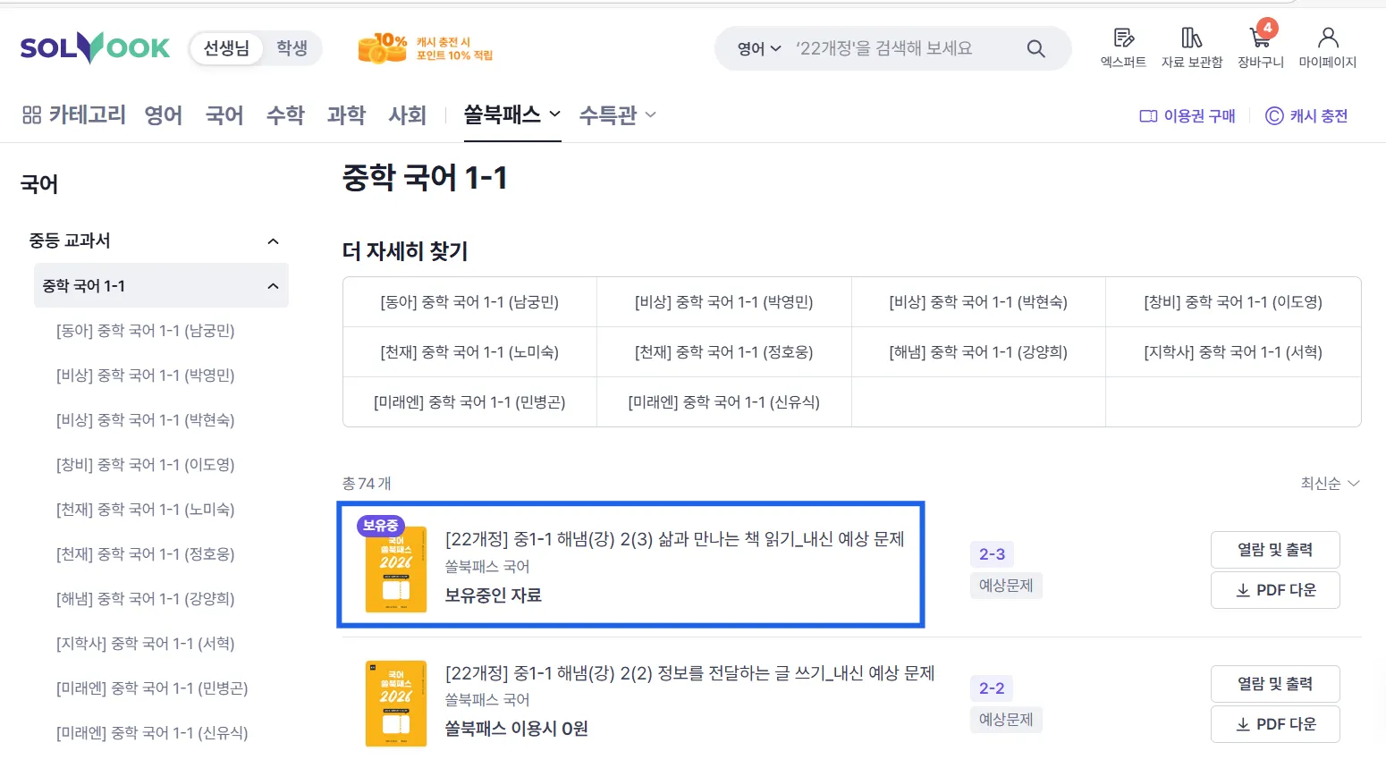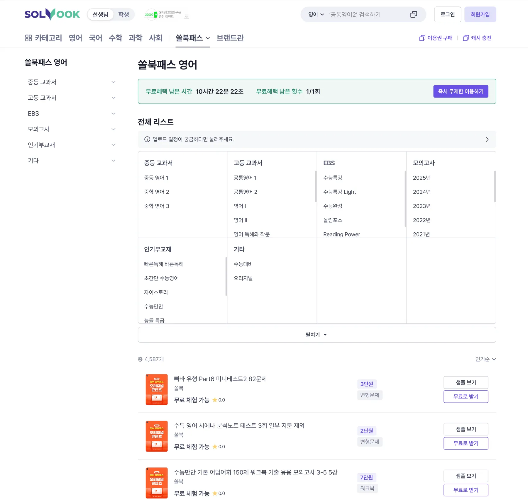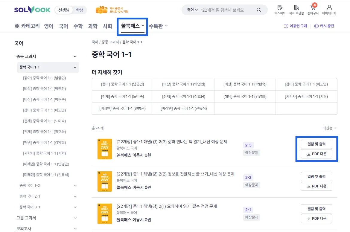 쏠북패스 이용 편의성 증대: 쏠북패스(영어/국어) 이용권 보유 시, 자료보관함을 거치지 않고 리스트에서 바로‘열람 및 출력’ ‘PDF 다운’이 가능해요.