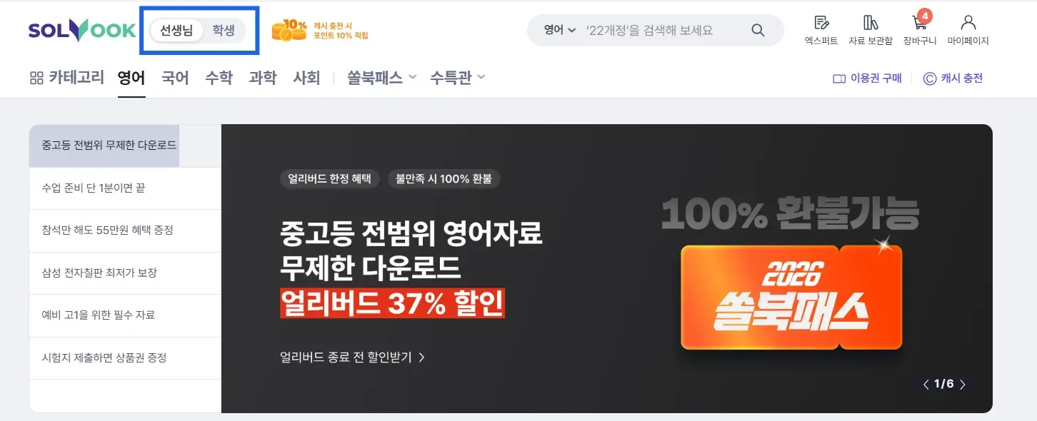 홈 환경 분리: 최상단 토글을 통해 '선생님 홈'과 '학생 홈'을 자유롭게 이동할 수 있으며, 로그인 시 타입에맞춰 자동 연결됩니다.