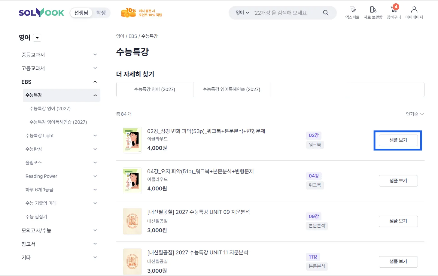 원스톱 이용: 개별 페이지에 접근하지 않아도 ‘샘플 보기’를 통해 자료를 확인하고 바로 구매하거나 보관함에 담을 수 있습니다.