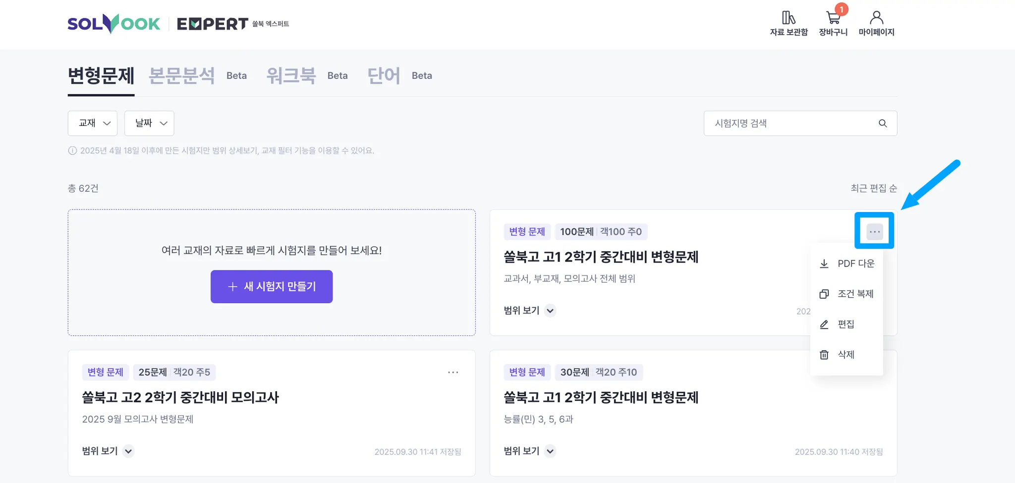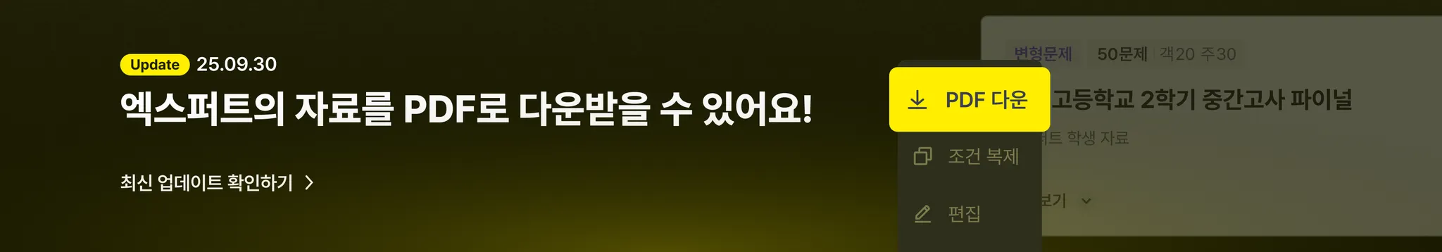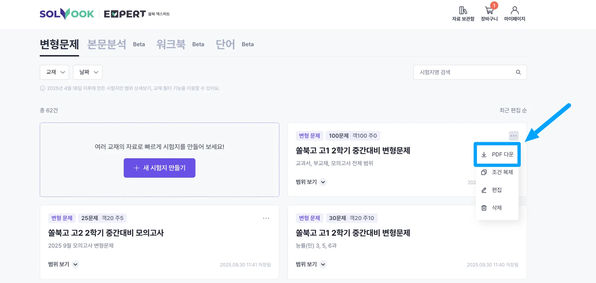 PDF 다운로드 기능은 시험지 보관함 - 자료별 ‘더보기’ 메뉴에서 확인할 수 있어요.