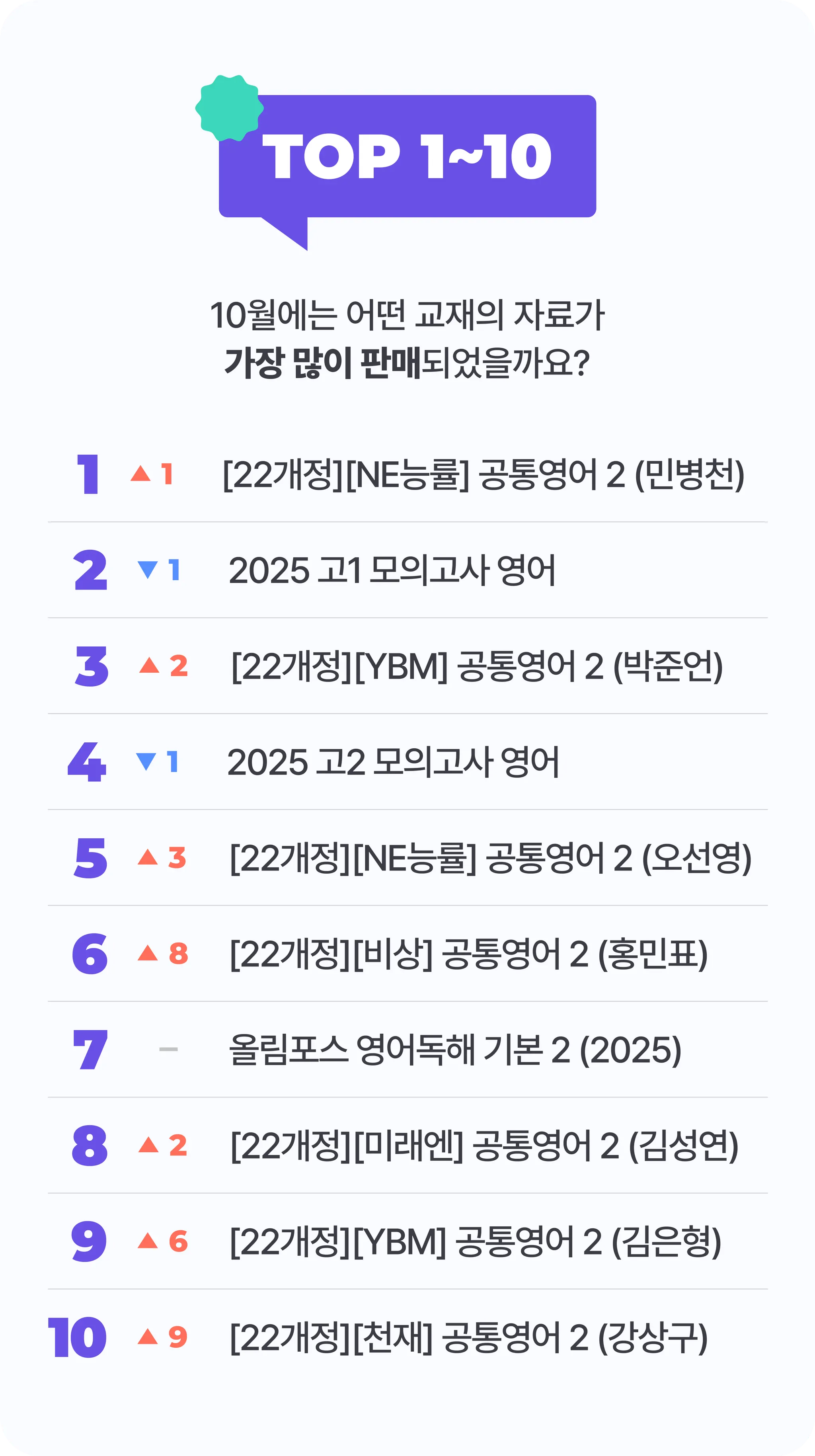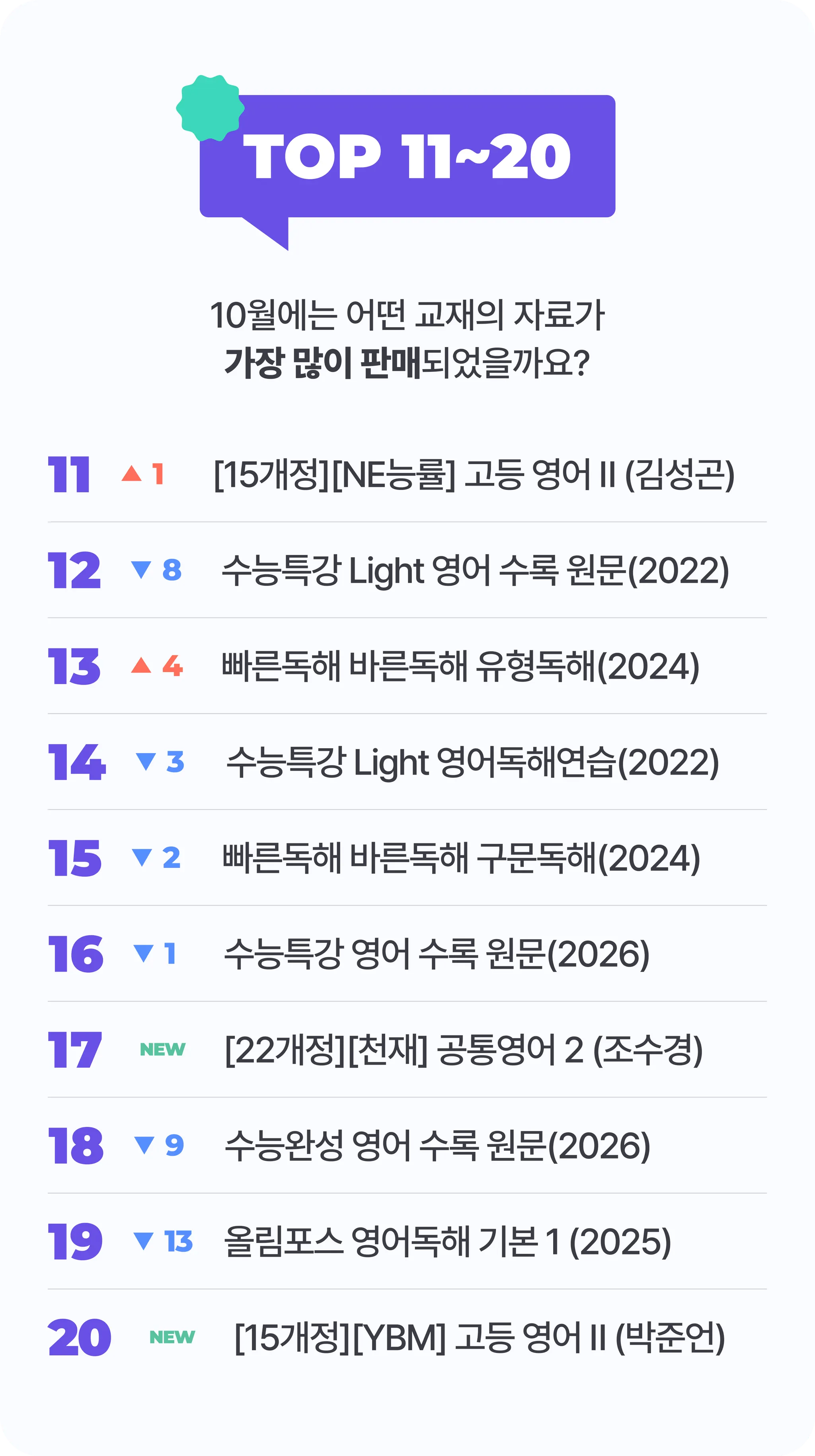 2025년 10월의 영어 라이선스 TOP 20을 안내해 드리겠습니다. 10모가 있었던 10월에는 어떤 교재의 자료가 가장 많이 판매되었을까요?
