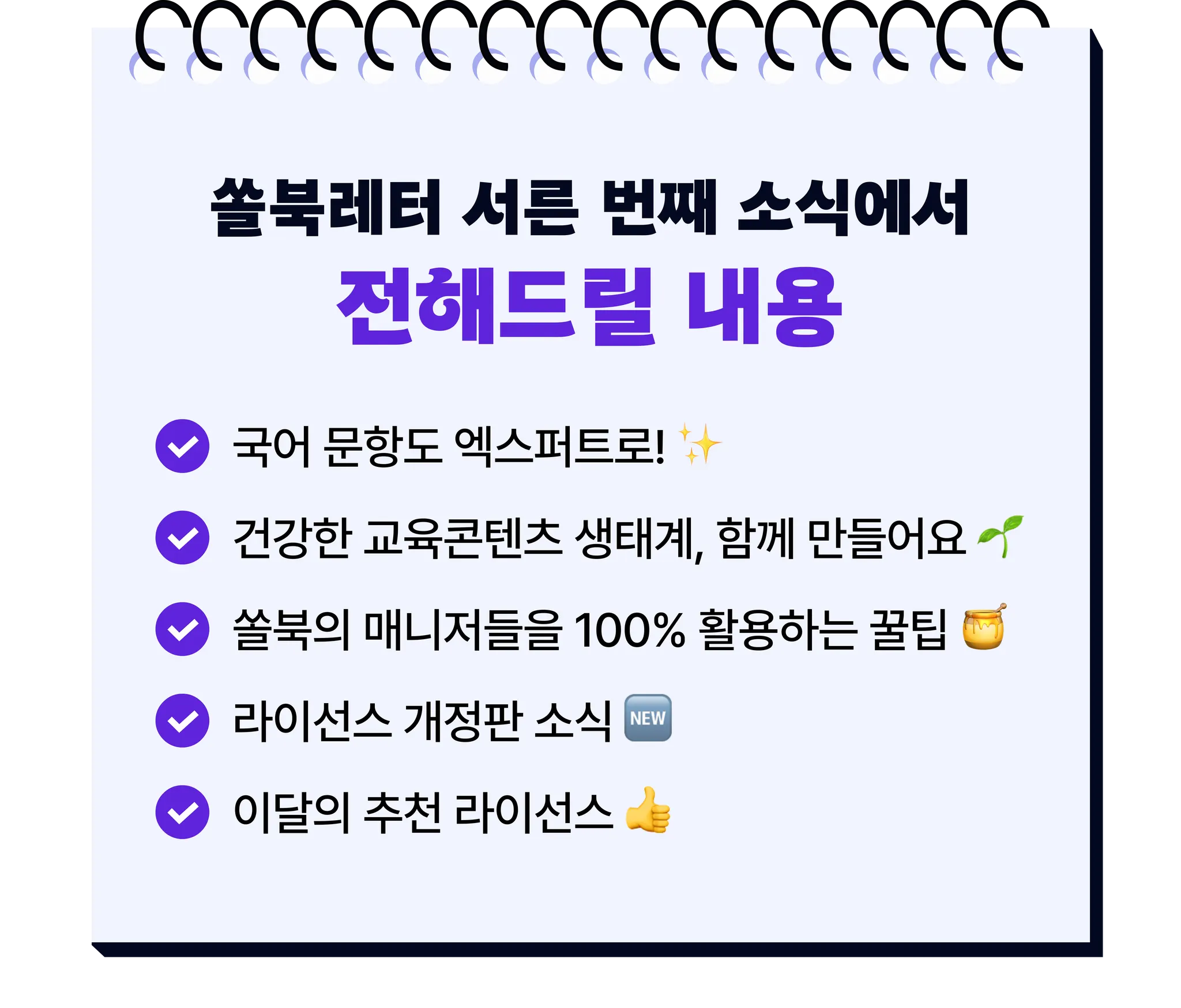 쏠북에 자료를 업로드하시는 저자분들을 대상으로, 매달 쏠북의 소식과 다양한 꿀팁을 전해드리는 쏠북레터! 오늘은 국어 엑스퍼트 오픈 소식과 함께, 라이선스 개정판 등 쏠북의 다양한 꿀팁을 알려드릴게요.