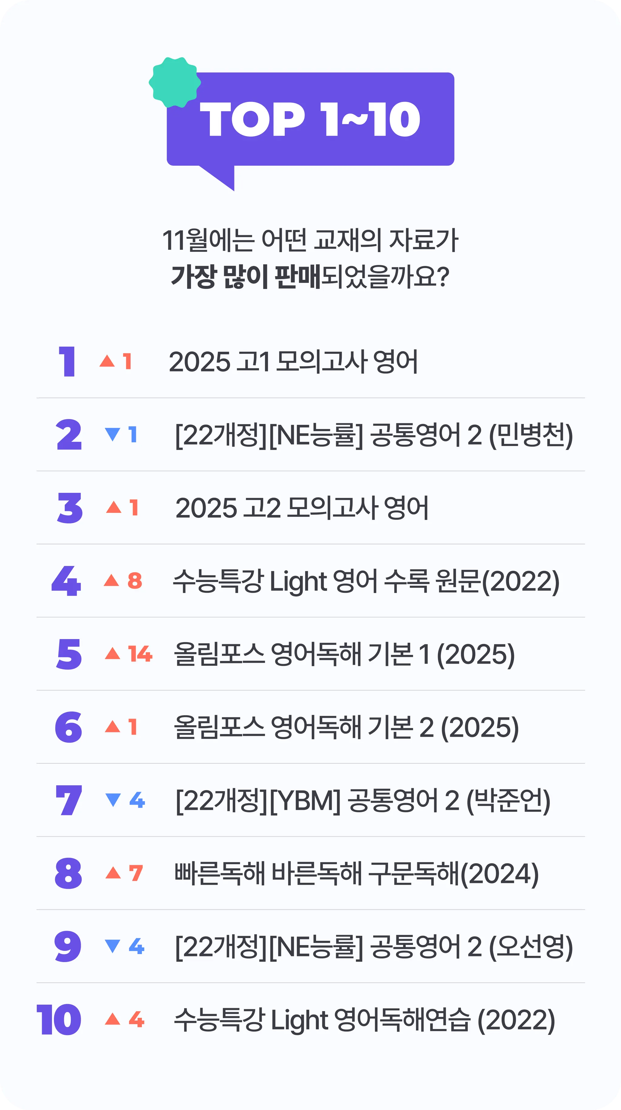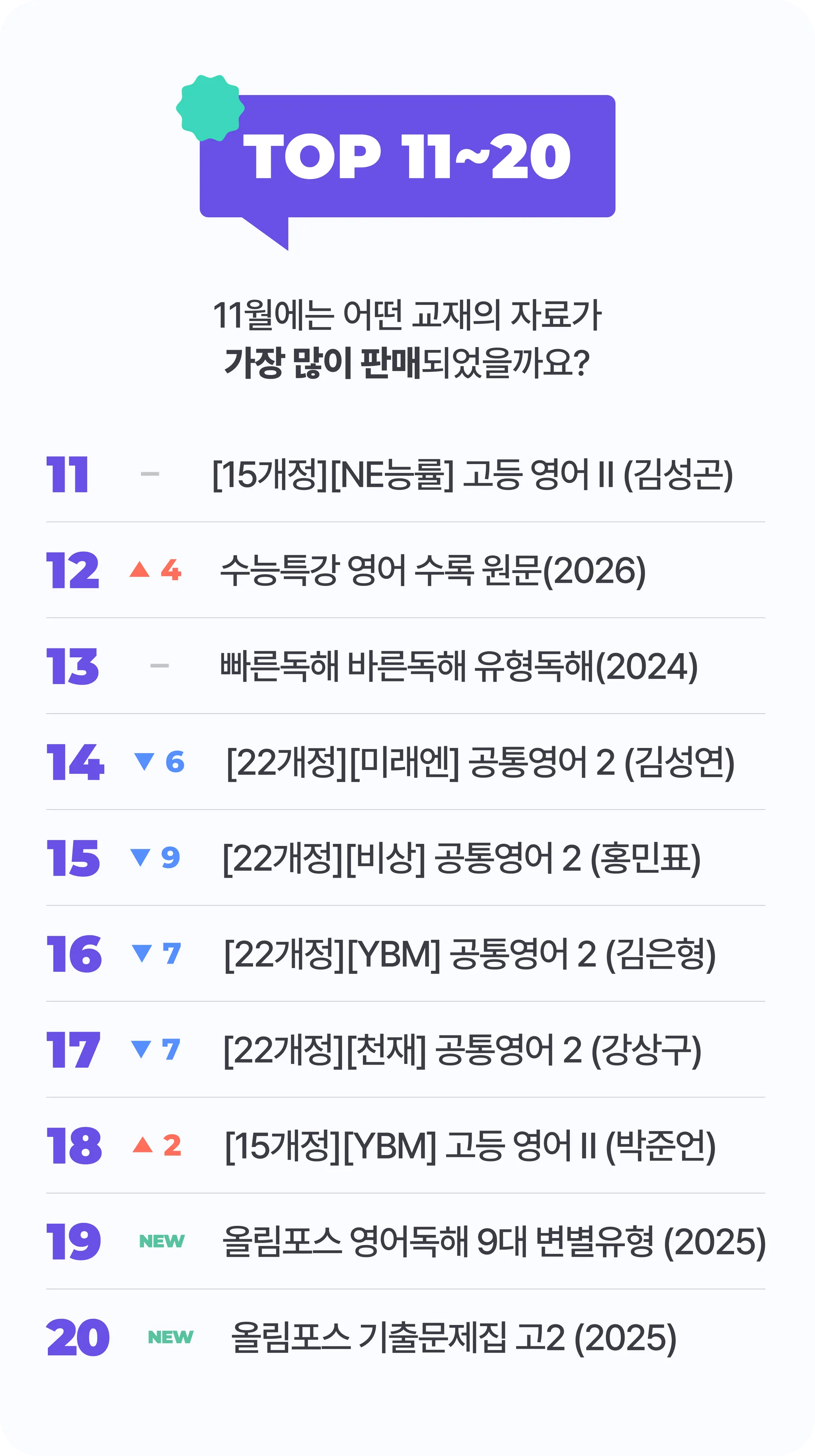 2025년 11월의 영어 라이선스 TOP 20을 안내해 드리겠습니다. 수능 시험이 있었던 11월에는 어떤 교재의 자료가 가장 많이 판매되었을까요?