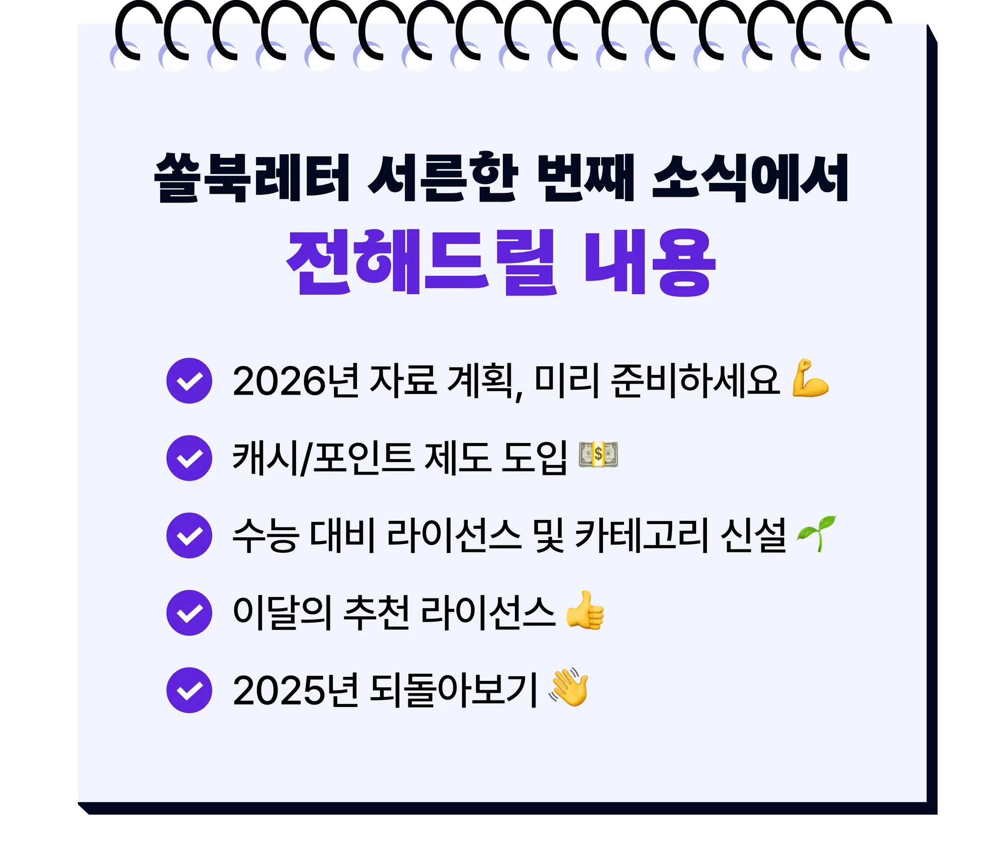어느덧 또 한 해가 저물어가고 있어요. 저자님들께 연말 인사를 드리기에는 다소 이른 날짜일 수 있지만, 올해의 마지막 쏠북레터에서 연말 인사를 드리고자 합니다. 2025년에도 쏠북과 함께해 주시고, 소중한 자료를 만들어주셔서 정말 감사드려요. 저자님의 정성과 노력 덕분에 수많은 강사분들뿐만 아니라 학부모와 학생분들이 더 나은 학습 경험을 누릴 수 있었습니다.