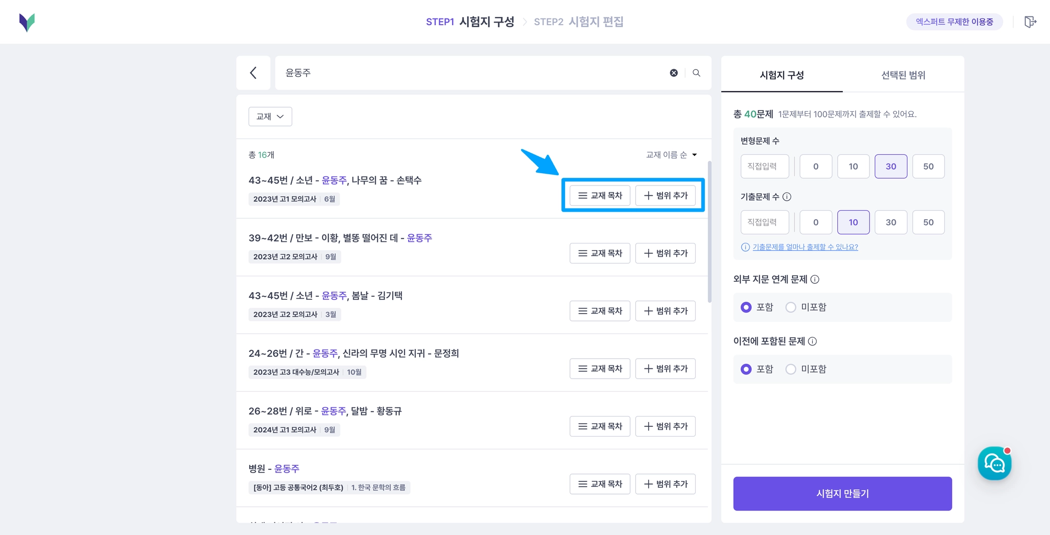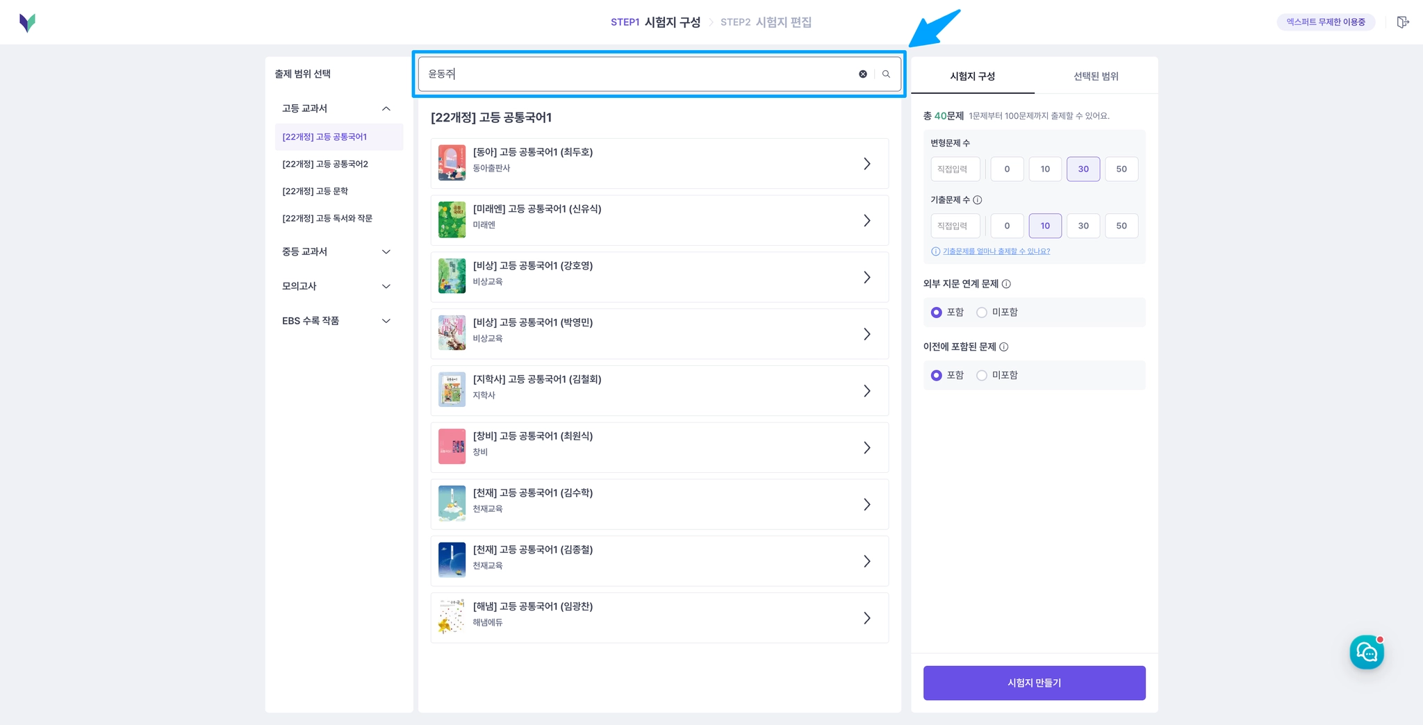 국어 엑스퍼트로 내신 대비에 최적화된 시험지를 가장 쉽고 빠르게 만들어보세요!