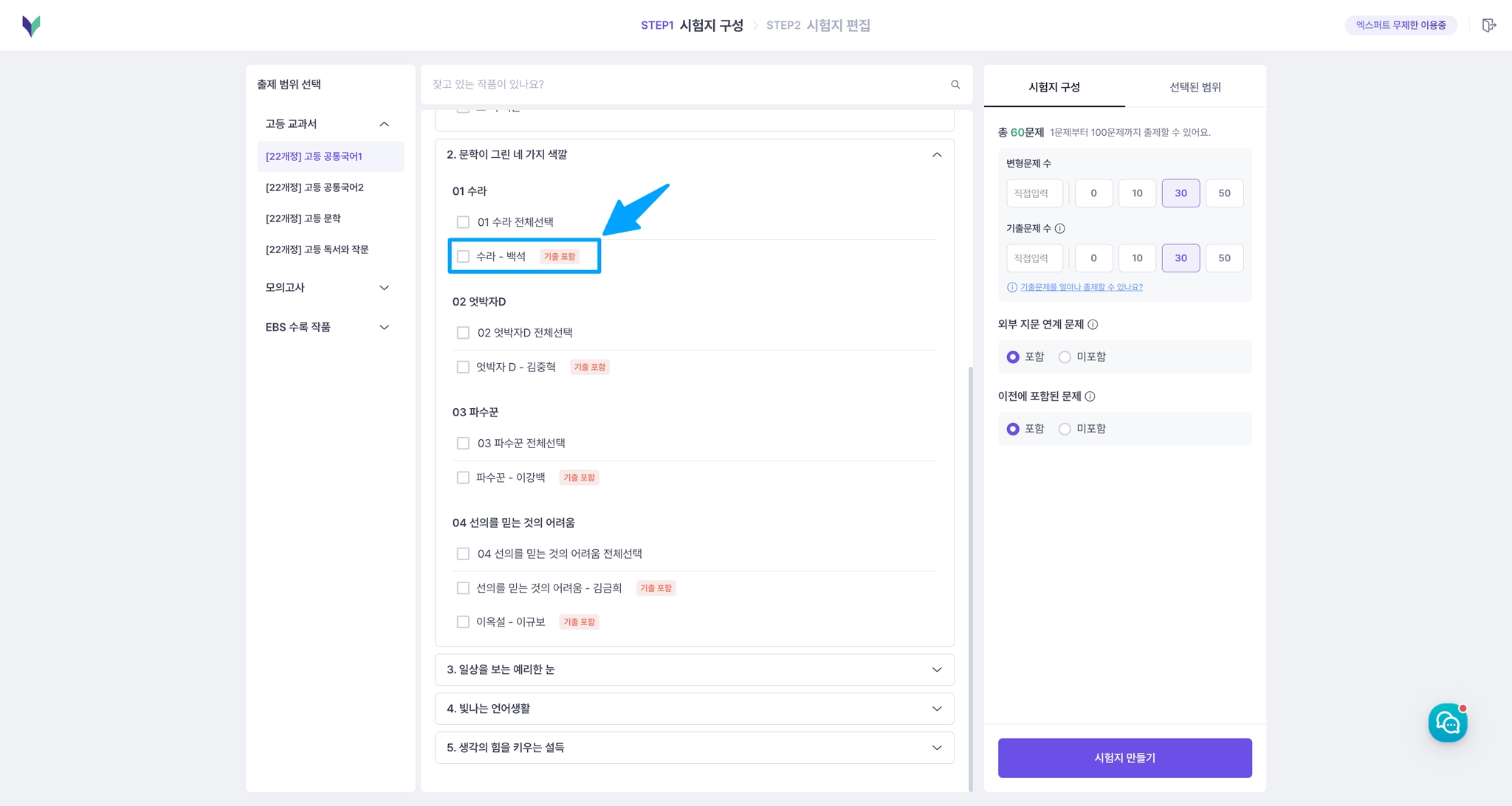 <Step 1 - 시험지 구성> 에서 중등 교과서 카테고리를 확인해보세요.