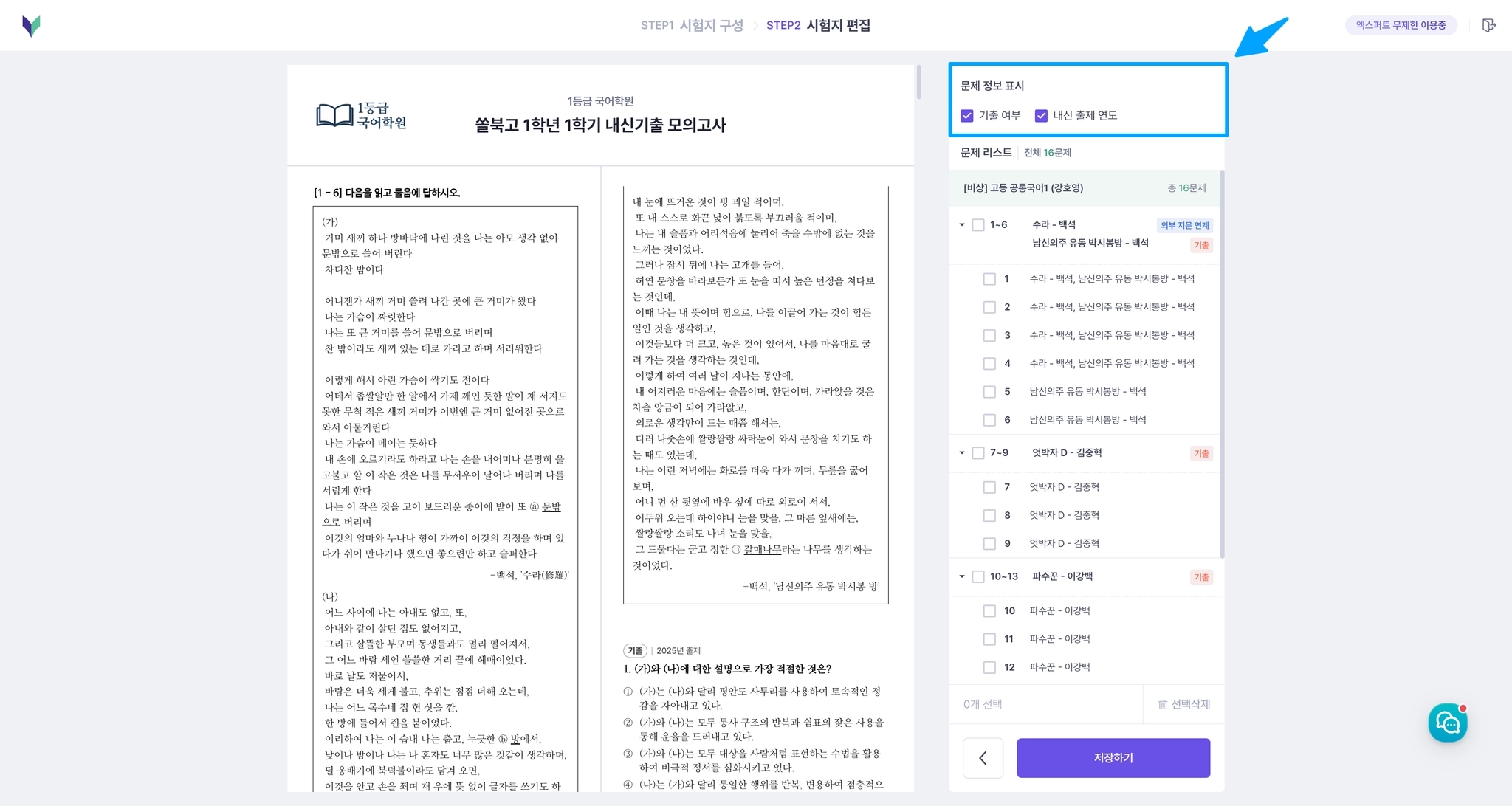 시험지를 편집할 때, 기출문제가 포함되어 있다면 ‘문제 정보 표시’ 옵션을 사용할 수 있어요.