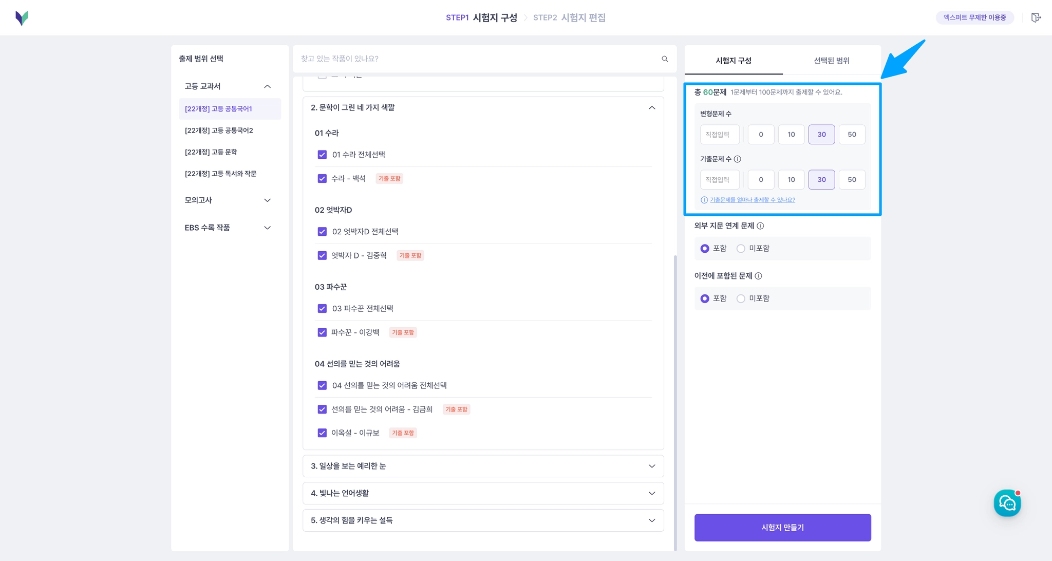 기출 포함 지문을 선택하면, 변형문제 수와 기출 문제 수를 따로 설정할 수 있어요.