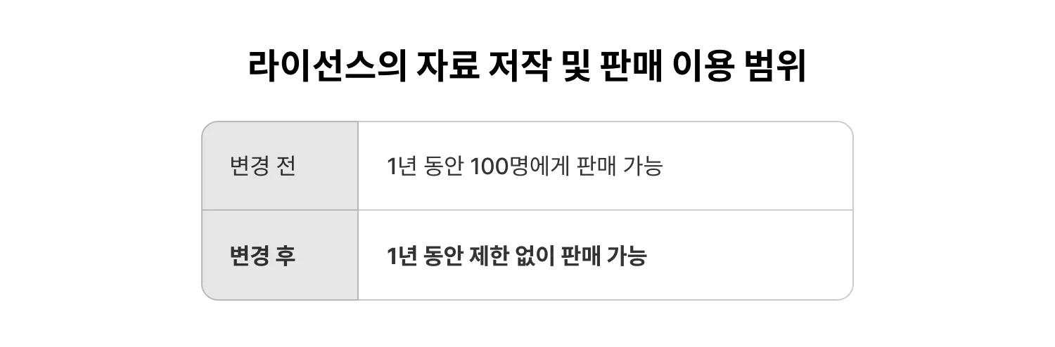 저자 여러분의 투자비(라이선스 비용) 대비 수익률을 높이기 위해, 라이선스 판매 출처와의 협의를 완료했으며 2024년 3월 1일부터 라이선스 슬롯 정책이 폐지될 예정이에요.