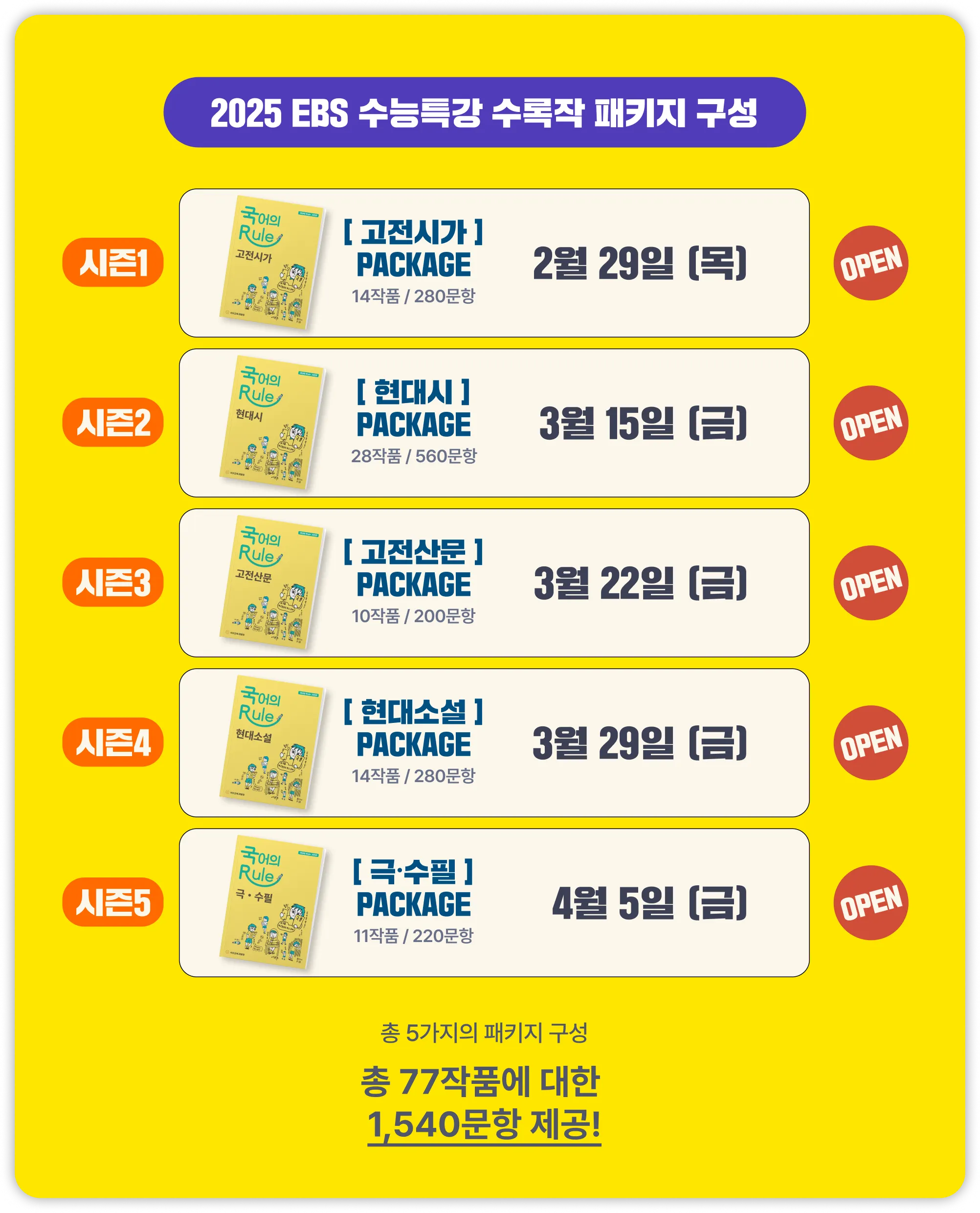 갈래 별로 시즌1부터 시즌5까지 5종의 자료 패키지를 순차적으로 오픈합니다.