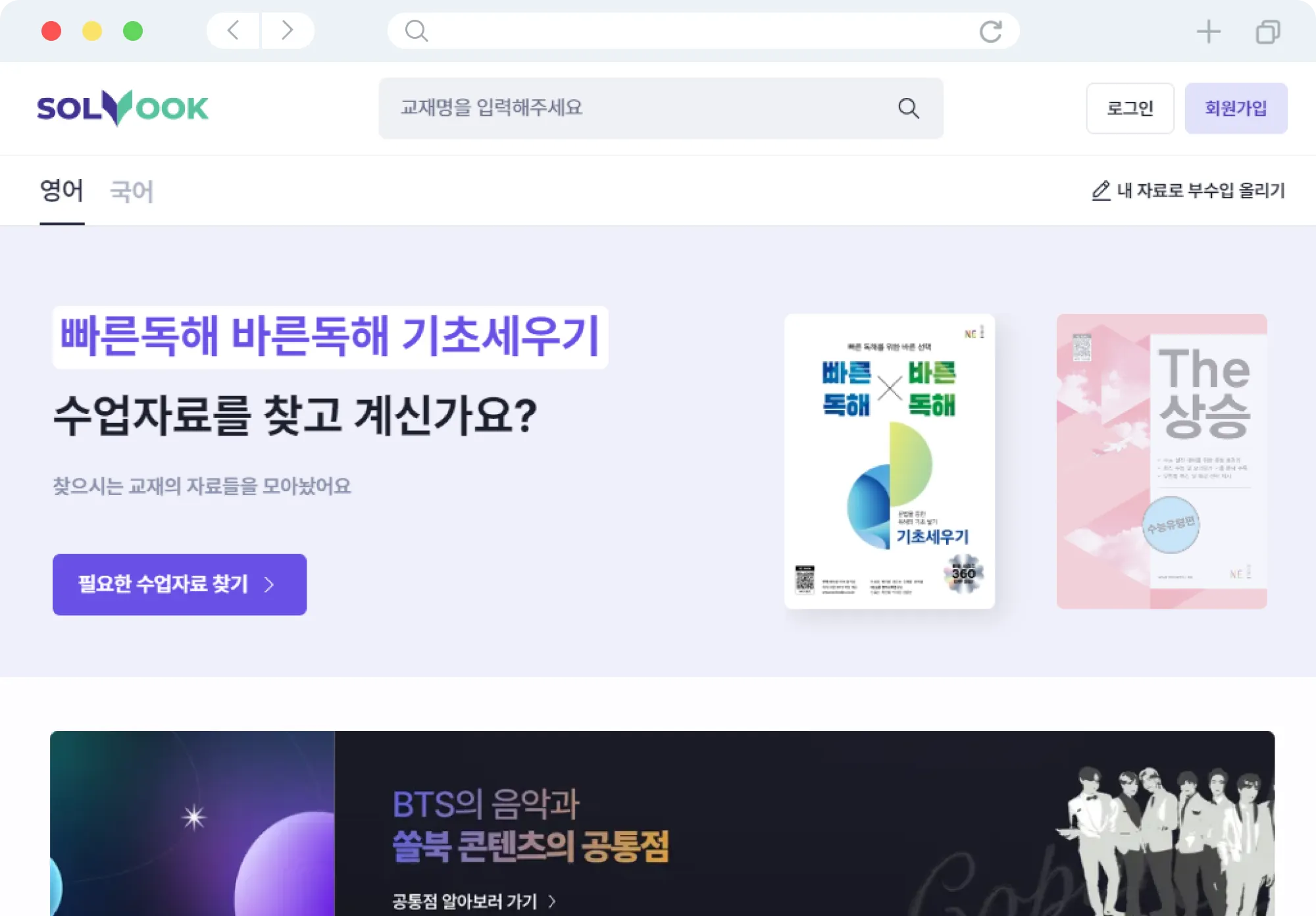 필요한 수업자료 찾기를 선택하면 내가 사용하는 교재를 기반으로 제작된 콘텐츠를 쏠북 메인에서 추천받을 수 있어요.
