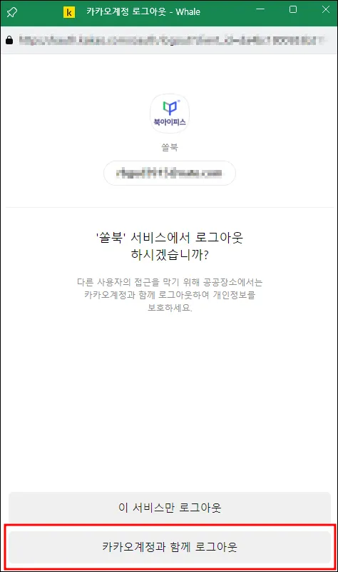 쏠북 홈페이지 우측 상단 [마이페이지] > [로그아웃] 을 클릭한 후 ‘카카오계정과 함께 로그아웃’ 을 누르신 후에 다시 로그인을 시도해보세요.