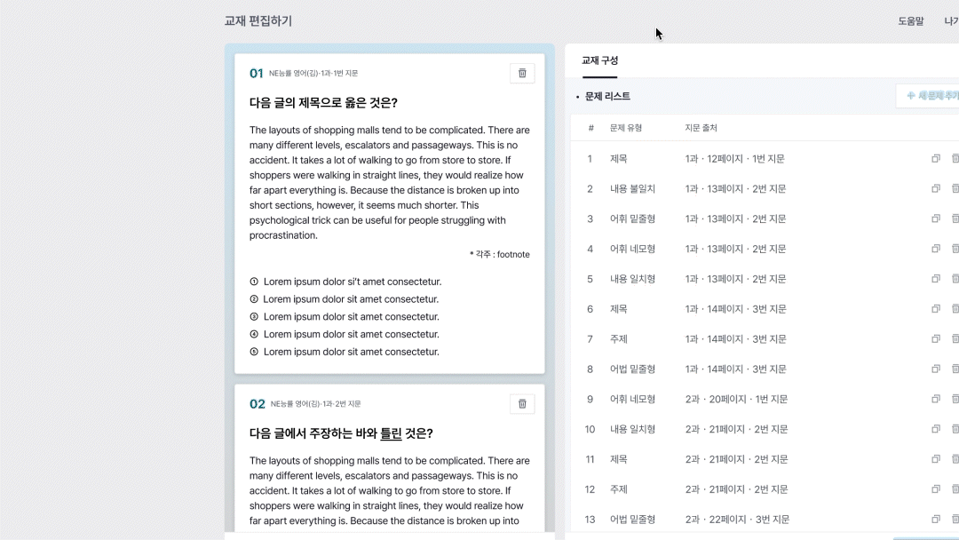 드래그 앤 드랍으로 간편하게 문제 구성을 바꿔보세요. 모든 번호는 자동으로 맞춰져요.