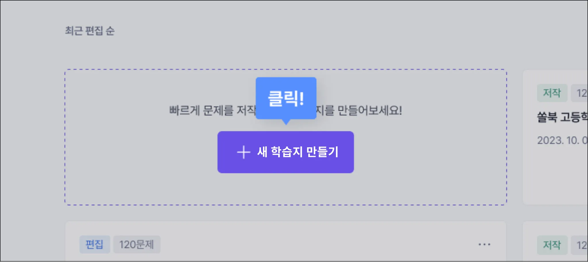 쏠북 홈페이지 우측 상단 ‘엑스퍼트’ 버튼을 클릭하고, 새 학습지 만들기를 클릭하세요.