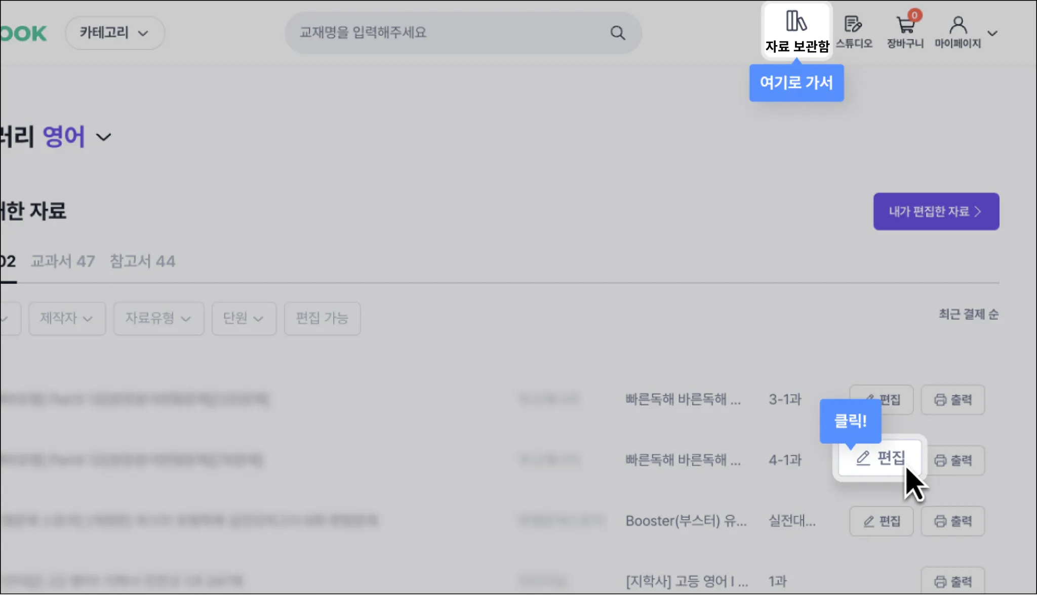 [자료 보관함]에서 구매한 편집 가능 자료를 확인하고, [편집] 버튼을 눌러보세요.