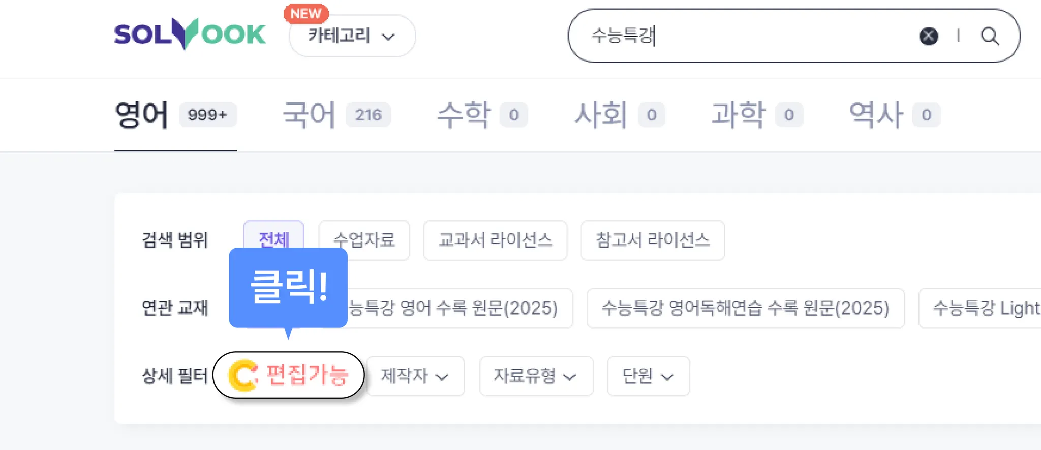 교재명을 검색하거나, 저자명을 검색한 후에 상세 필터에서 [편집가능] 버튼을 누르면 검색할 수 있어요.