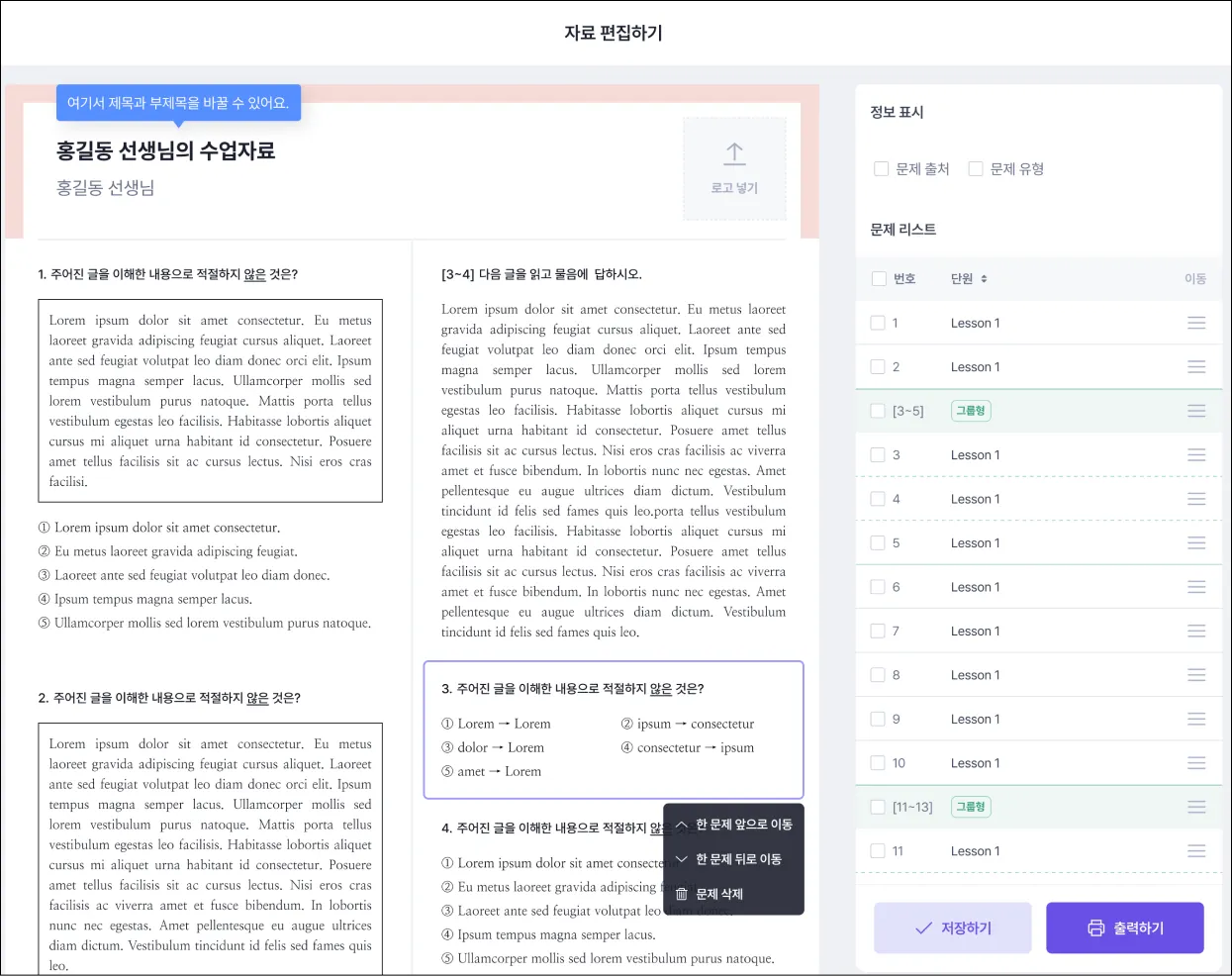 화면 우측 [문제 리스트] 에서 순서를 변경하거나, 특정 문제를 삭제할 수 있어요.
